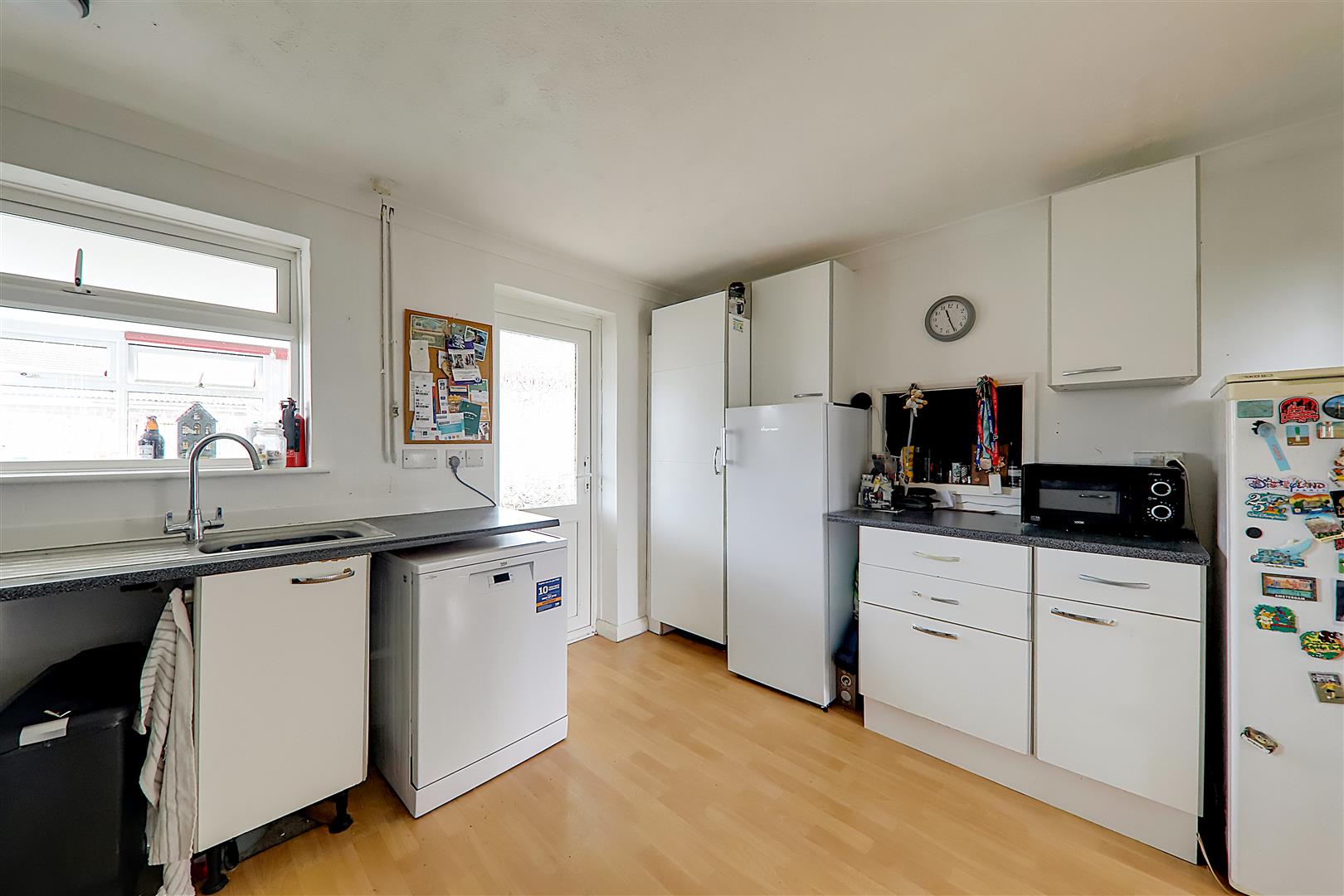 Roll edge work surface having inset single drainer stainless steel sink with mixer tap and draining board. Space for freestanding cooker. Space and plumbing for dishwasher. Space for tall fridge and freezer. Matching range of units comprising cupboards, drawers, eye level wall units and larder cupboard. Radiator. Double glazed window.