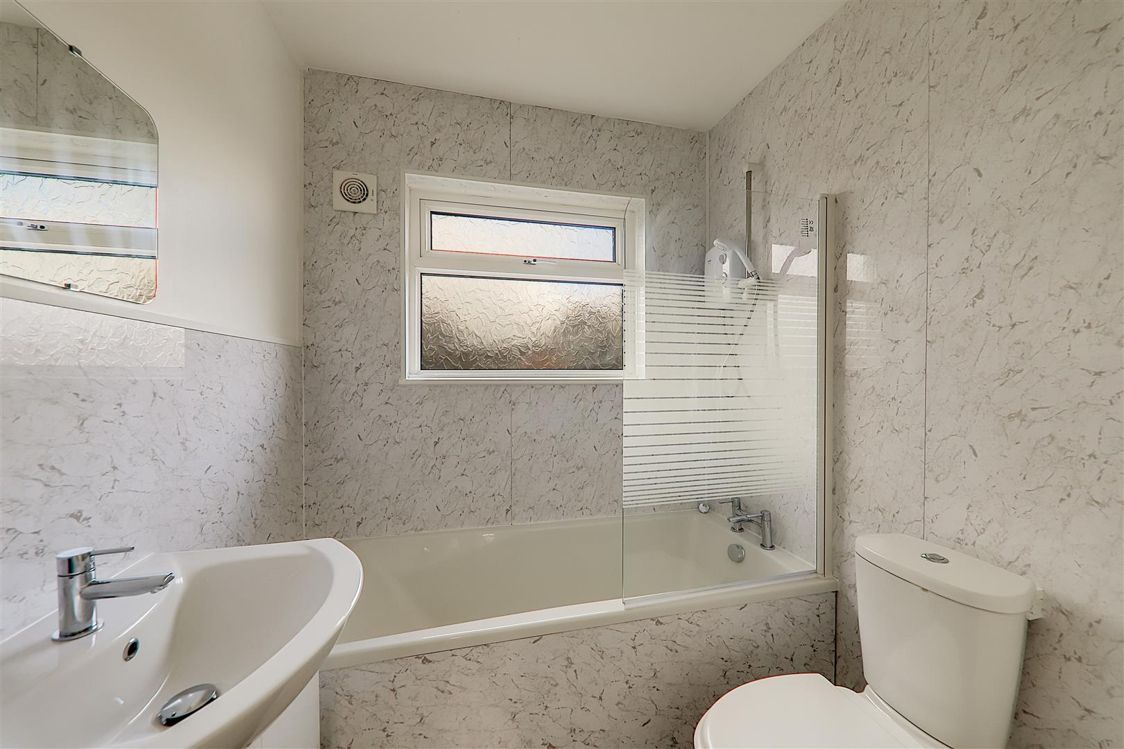 White suite comprising panelled bath with mixer tap and glazed shower screen. Triton electric overhead shower. Vanity unit having wash hand basin and mixer tap with storage below. Ladder style towel radiator. Close coupled WC. Cupboard housing hot water tank. Double glazed window. Extractor fan.