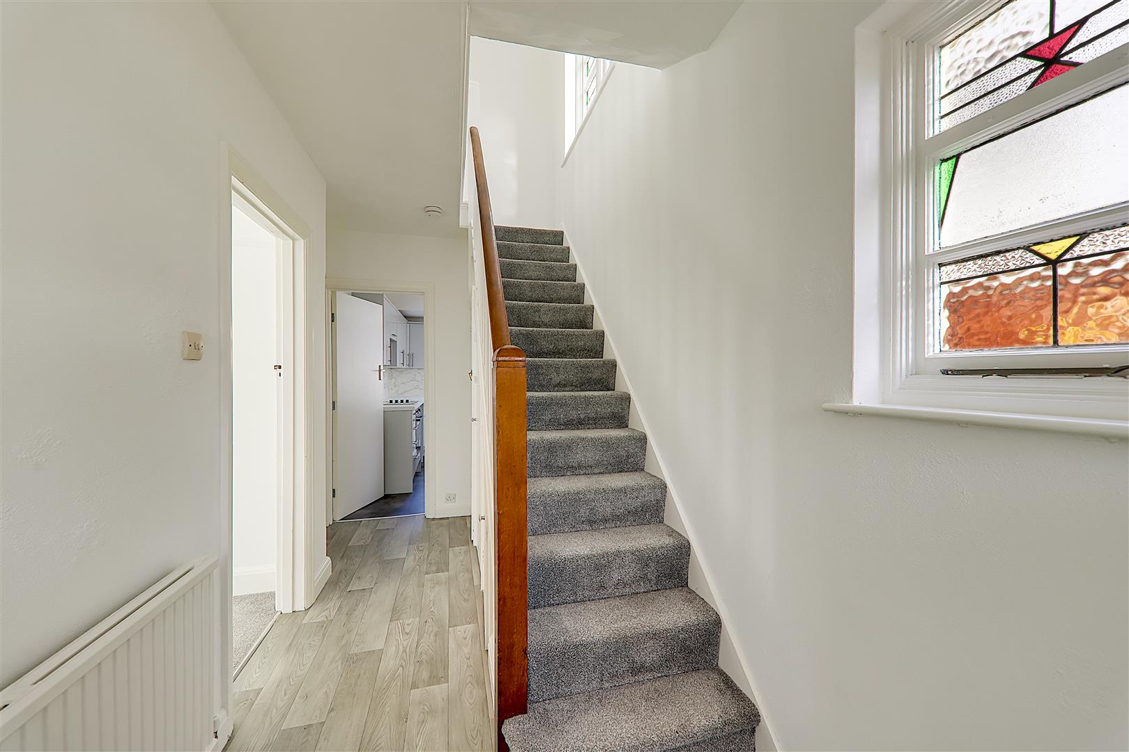 Glazed stained glass window to side. Radiator. Low level Storage cupboard. Under stairs storage cupboard.