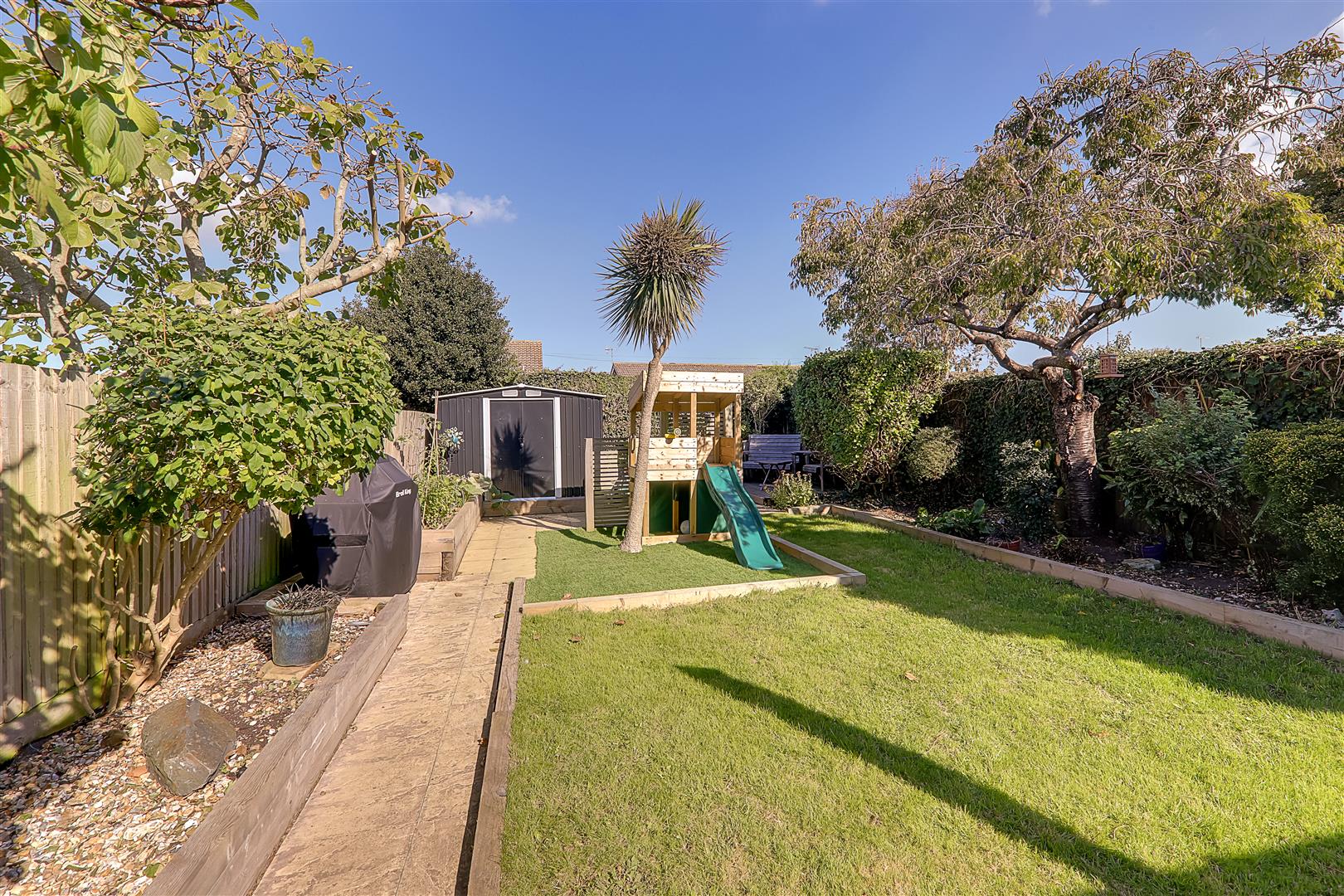 Paved patio area. Central lawn bordered by raised sleeper beds and borders with shrubs and plants. At the far end, raised deck and pebbled area. Metal shed. Bike store. Access to side driveway.