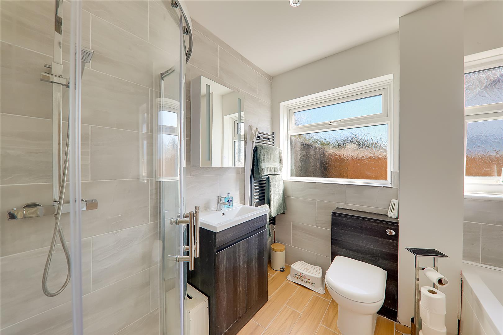 Newly fitted modern fitted bathroom suite. Full length bath with mixer tap and hand held shower. Tiled walls. Concealed cistern toilet. Large corner shower with dual function riser rail shower. Sink with cabinet storage below. Wall mounted mirror cabinet with LED lighting and demister. Heated towel rail. Two obscured double glazed windows. Newly fitted hard flooring. Inset spotlights.