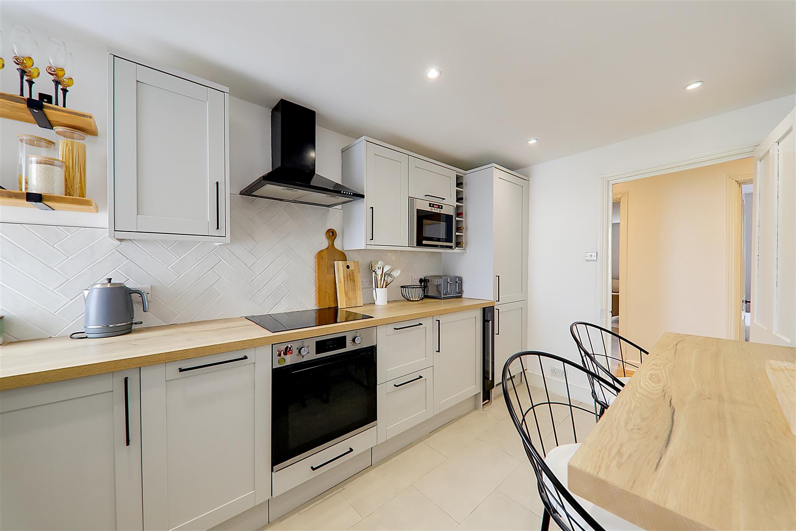 Square edge work surface having inset single drainer sink with swan neck mixer tap and draining board. Four ring 'Lamona' induction hob with extractor cooker hood above. Fitted fan oven below. Intergrated 'Lamona' appliances including washing machine, dishwasher, tall fridge/freezer and wine cooler. Excellent range of matching cupboards, drawers and eye level wall units. Breakfast bar with space for stools and storage cupboards underneath. Inset ceiling spotlighting. Glazed sash windows. Cupboard housing hot water tank.