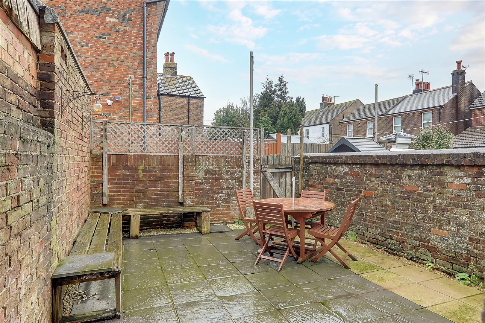 Walled surround. Paved for ease and maintenance. Access via rear gate. Outside tap.