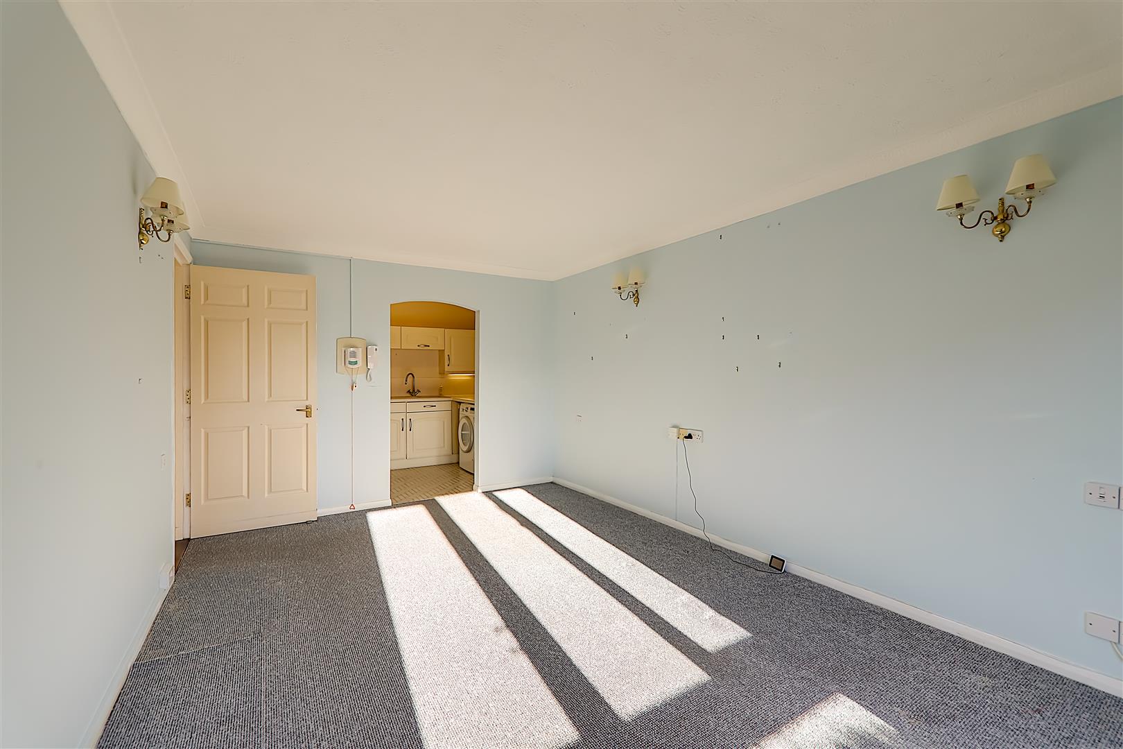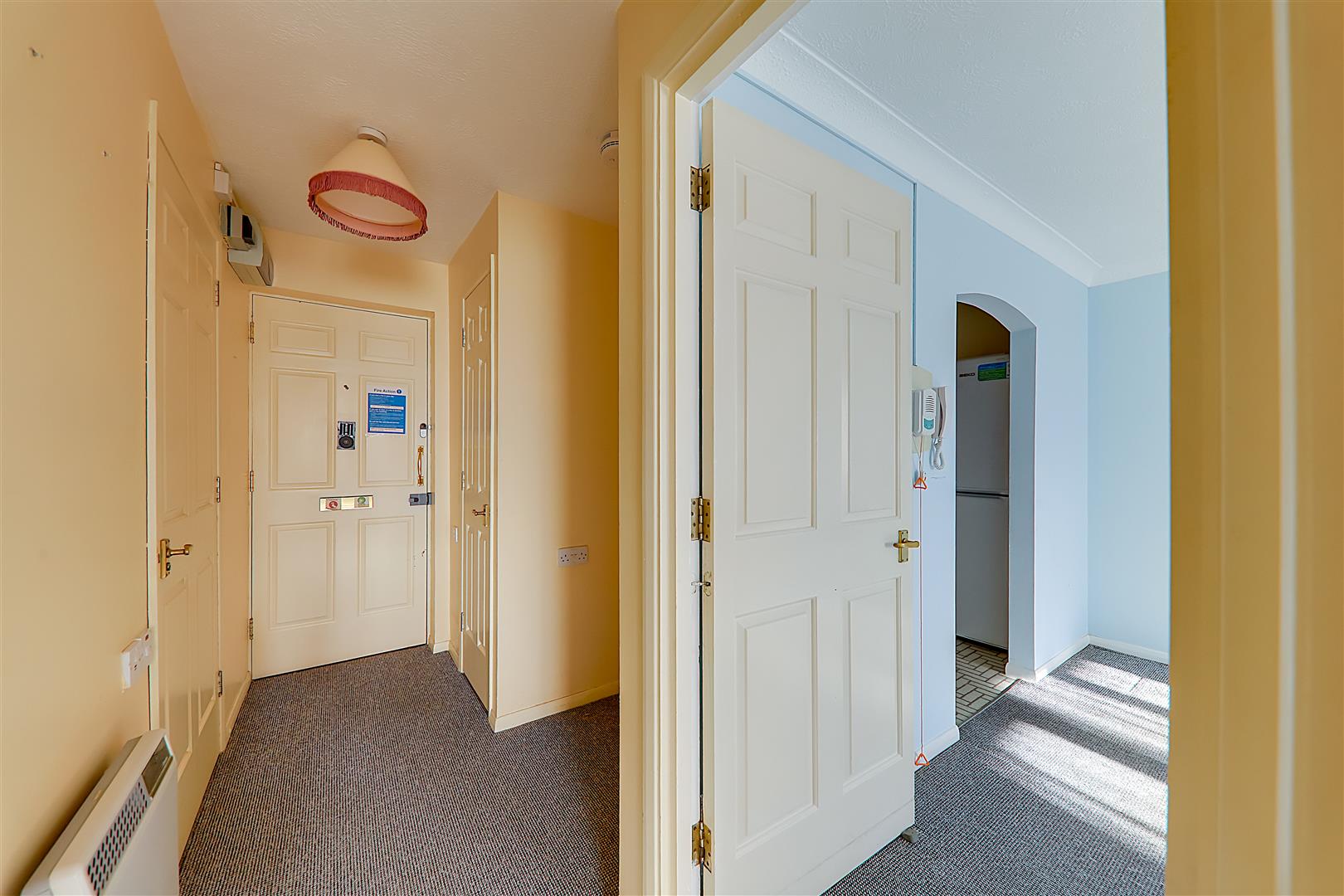 South aspect via double glazed windows and door with security shutter. Electric storage heater. Entryphone system. Four wall light points. warden pull cord. Coved and textured ceiling.