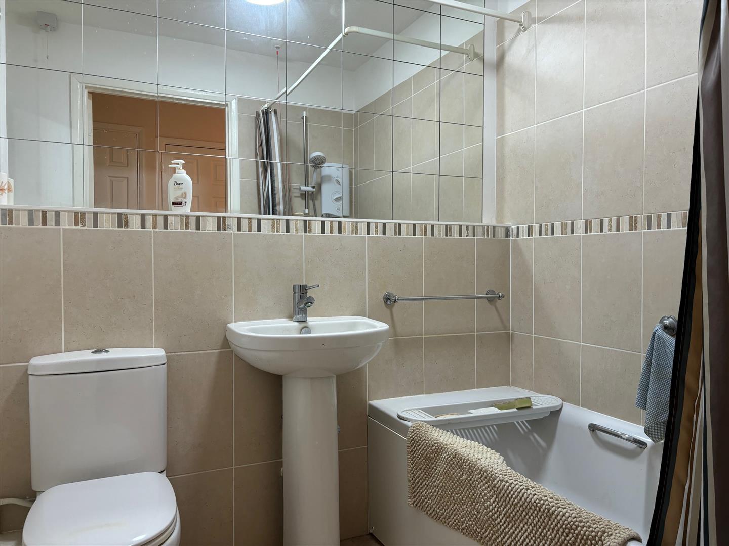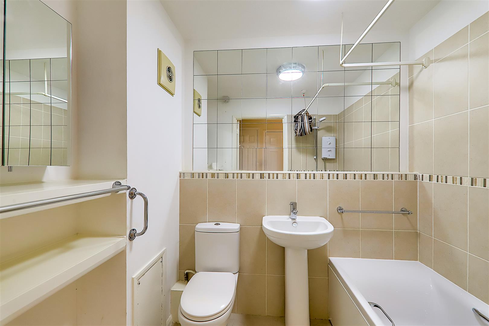 Fitted suite comprising of a panelled bath having twin hand grips and shower unit over. Pedestal wash hand basin with mixer taps. Push button w.c. Fitted display shelving. Extractor fan. Part tiled walls. Warden pull cord. Textured ceiling.