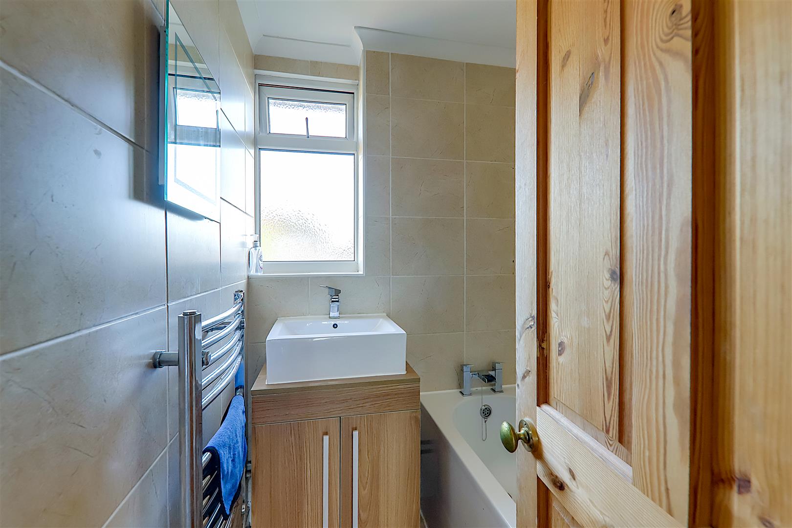 Comprising of a panelled bath having mixer taps and shower unit over with shower screen. Wash hand basin with mixer taps and storage cupboard below. Chrome ladder design radiator. Fully tiled walls. Levelled and coved ceiling with spotlights. Obscure glass double glazed window.