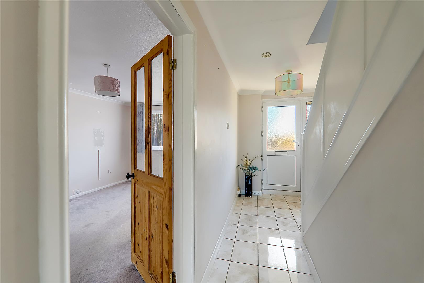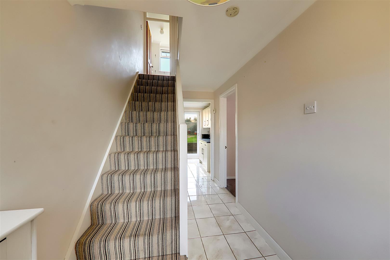 Accessed via a part obscure glass double glazed front door with matching window to side. Radiator in decorative casing. Tiled flooring. Central heating thermostat. Levelled and coved ceiling. Staircase to first floor landing with an understairs storage cupboard.