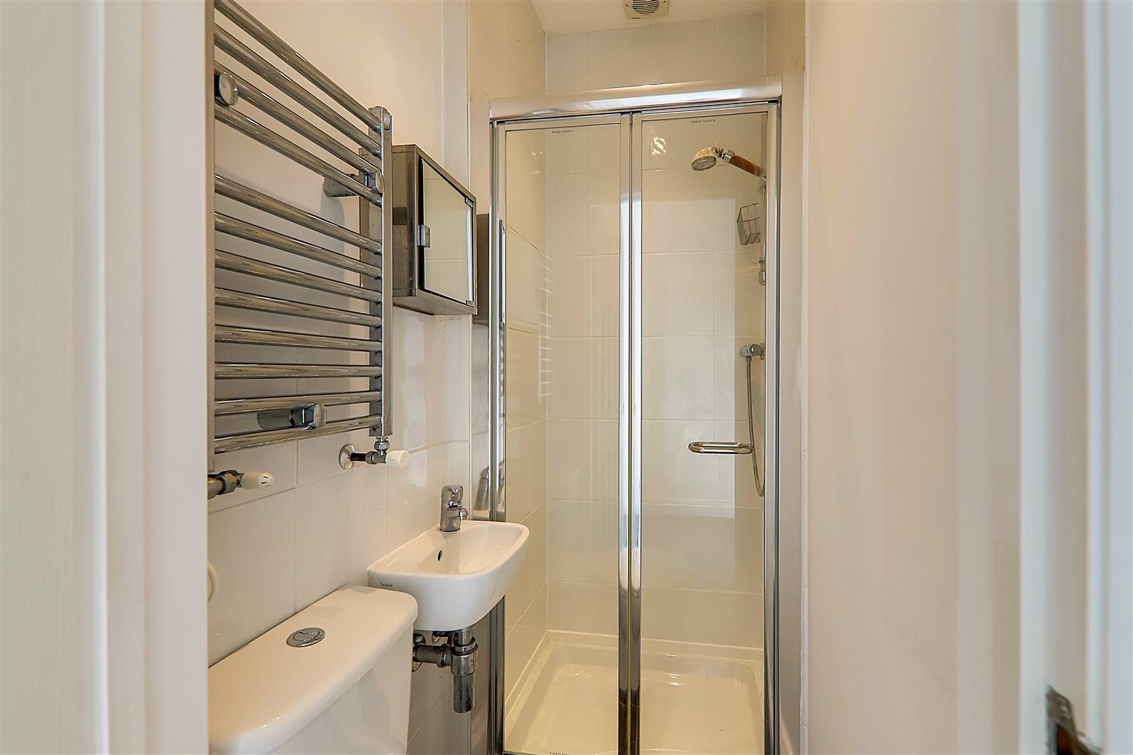 Comprising of step in shower cubicle with wall mounted shower attachment and glass shower screen. Low level flush w.c. Part tiled walls. Radiator. Extractor fan. Inset spotlights.