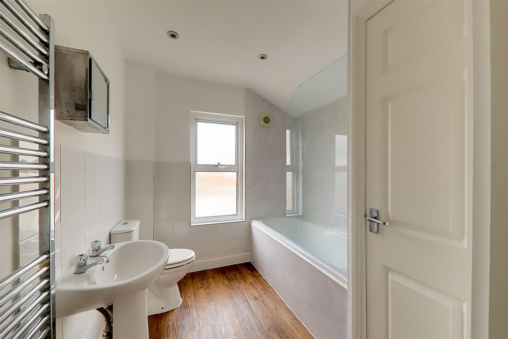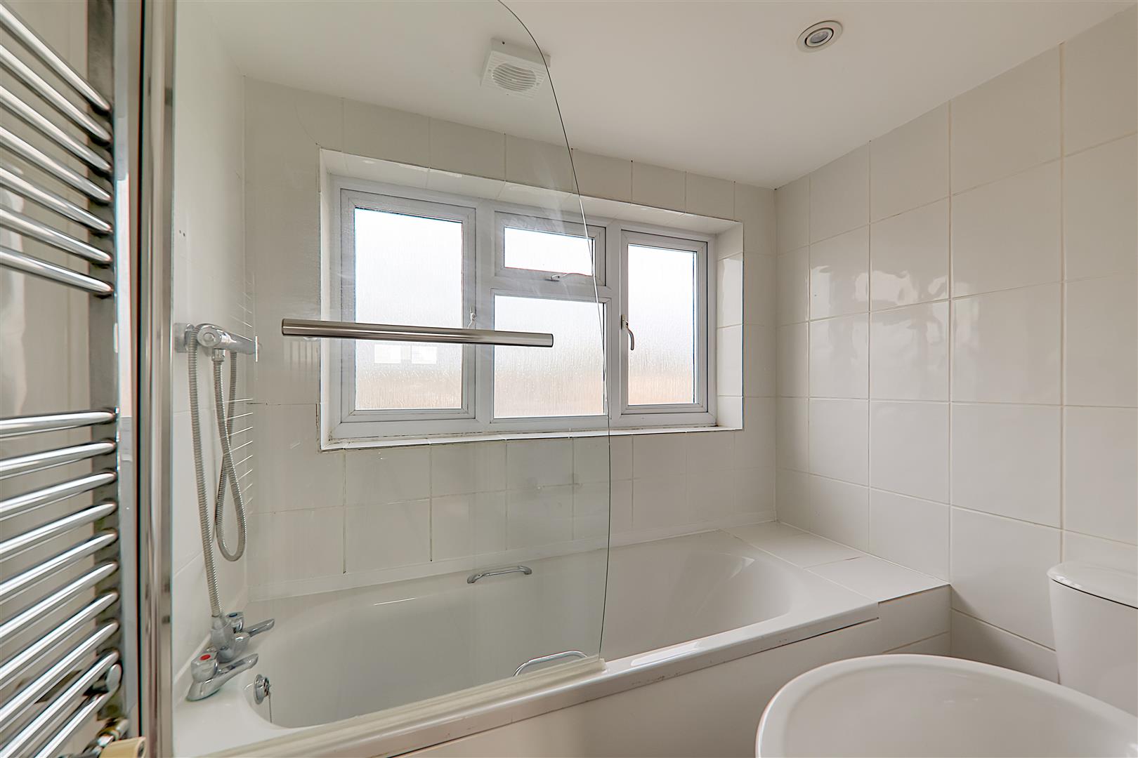 Comprising of a white suite with panelled bath with glass shower screen and wall mounted shower attachment. Low level flush w.c. Pedestal wash hand basin. Wall mounted radiator. Cupboard housing hot water tank. Further smaller cupboard. Part tiled walls. Wood effect floor. Extractor fan. Double glazed window. Inset spotlights.