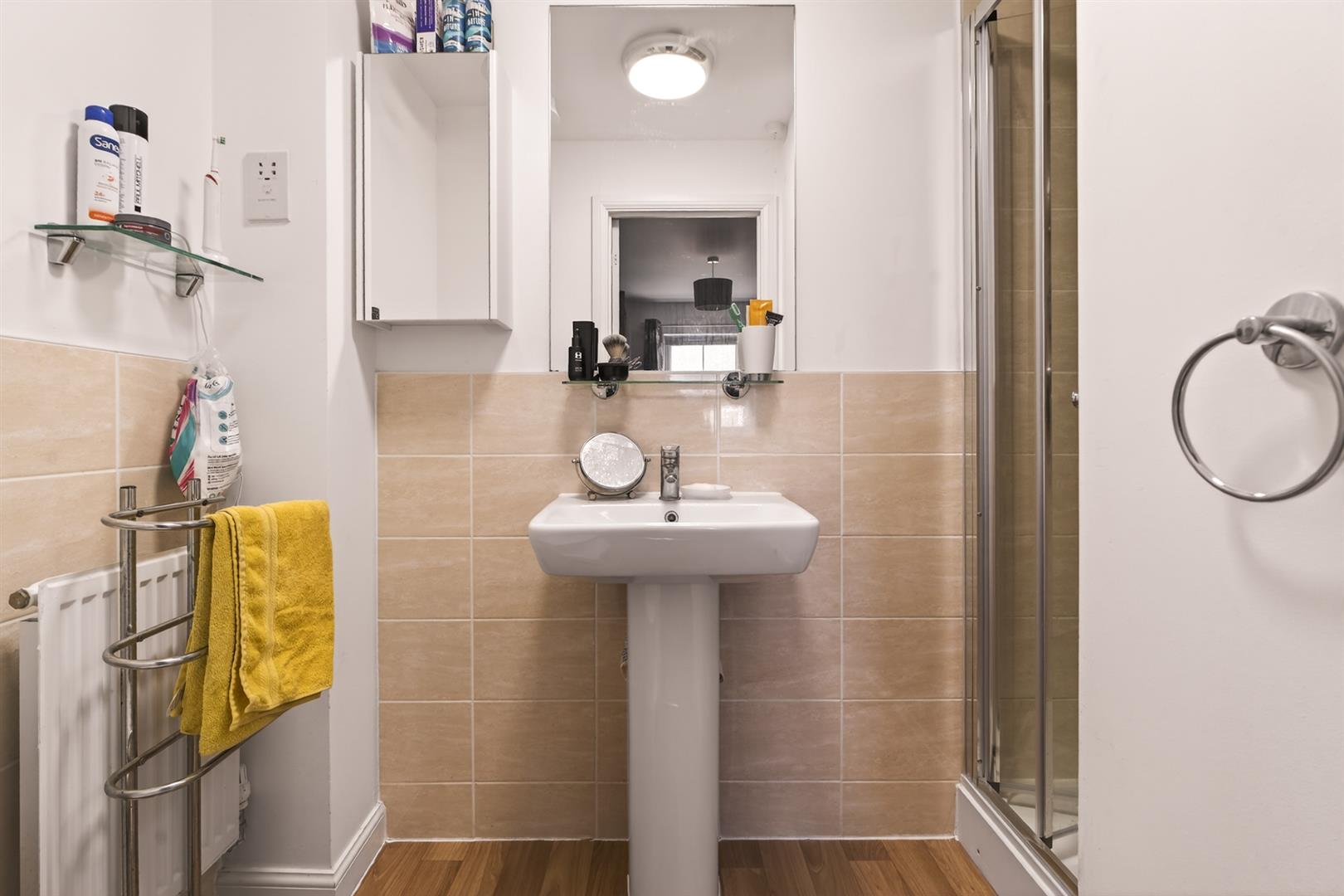 Close coupled WC. Pedestal wash hand basin. Radiator. Part tiled walls. Dome light. Step in shower cubicle with glass door. Riser rail shower with wall mounted controls.