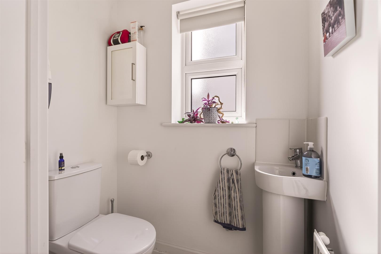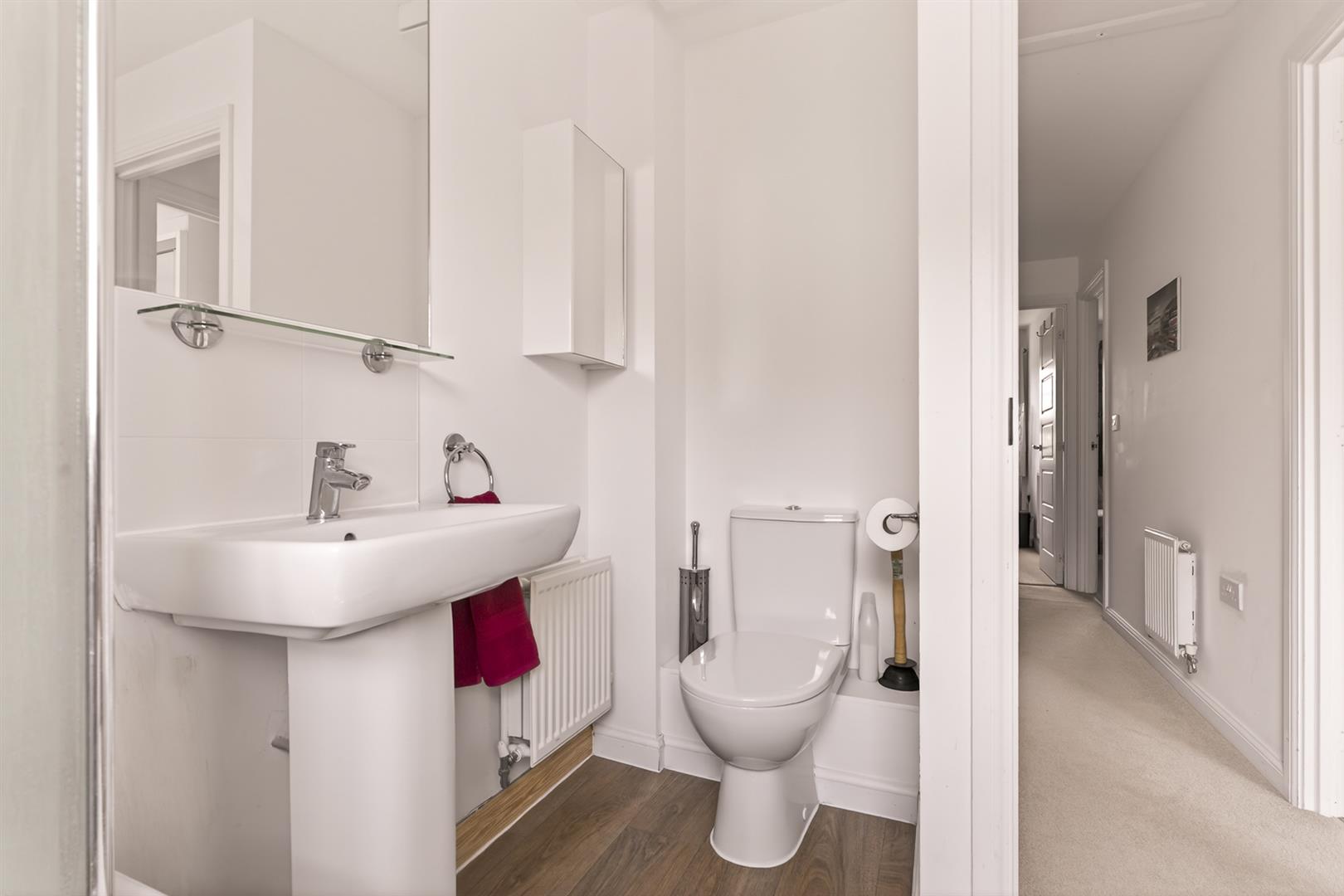 Tiled floor. Close coupled WC. Pedestal wash hand basin with tiled splashback. Obscure double glazed window. Extractor fan. Levelled ceiling with pendant light. Radiator.
