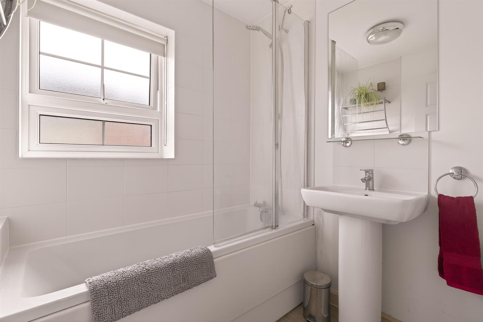 Bath with riser rail shower above. Glass shower screen. Pedestal wash hand basin. Close coupled WC. Part tiled walls. Radiator. Dome light. Obscure glass window.