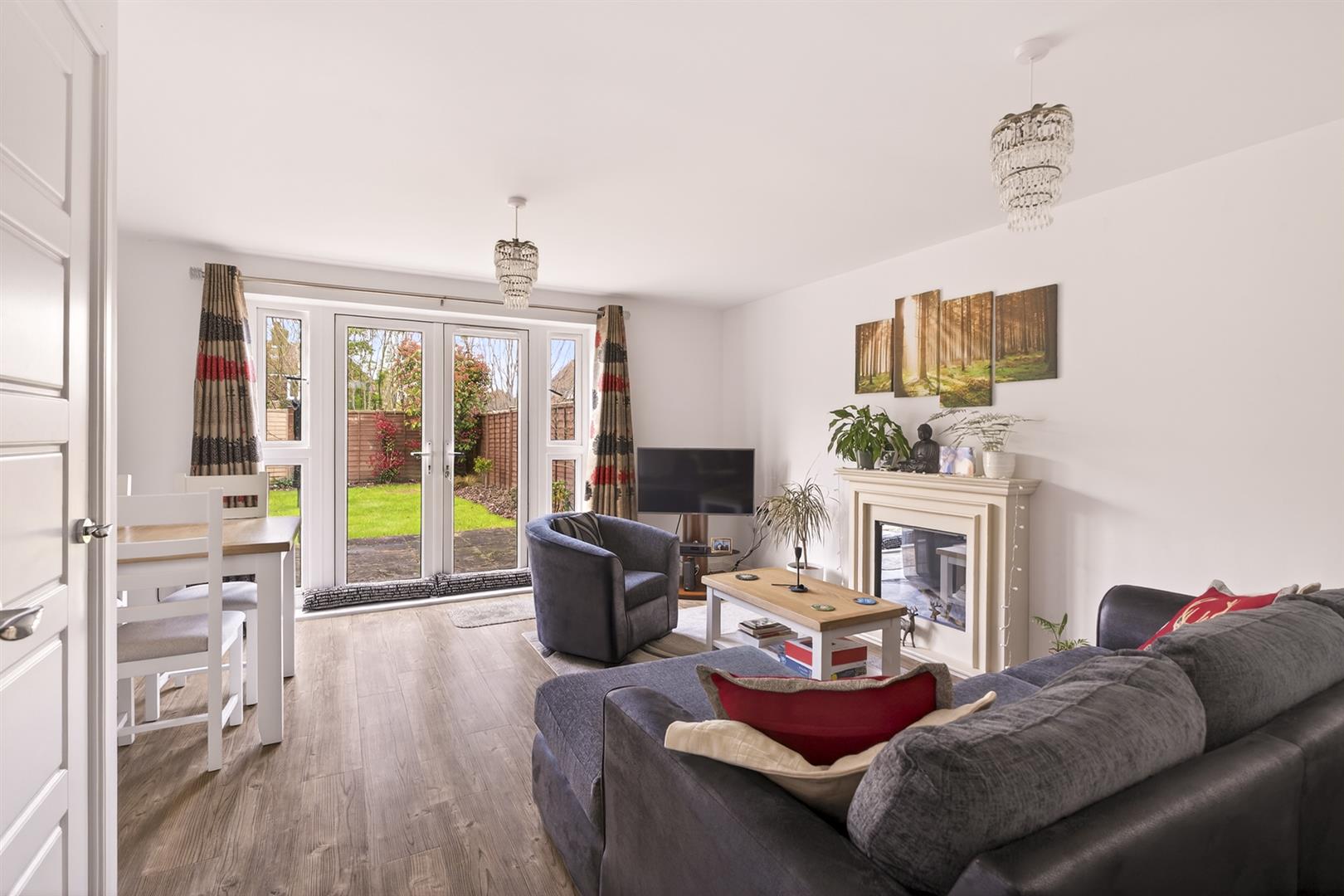 Well proportioned room providing space for living & dining room furniture. Wood effect flooring. Electric fireplace. Levelled ceiling with pendant light. Two radiators. Double glazed French doors with windows and glass panels to side, leading out onto rear garden. Access to under stairs cupboard.