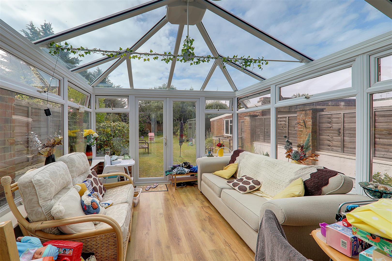 With glass roof and double glazed windows and double doors opening to the rear garden. Wood effect floor. Wall mounted electric heater.