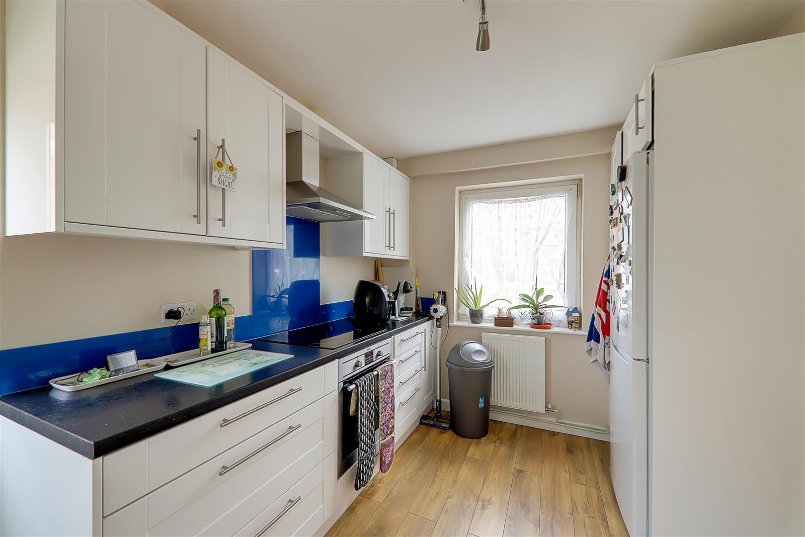Range of work surfaces with high gloss white cupboards and drawers fitted under. Inset single drainer sink unit. Space for washing machine, dishwasher, tumble dryer and fridge/freezer. Fitted Zanussi hob wth AEG oven under and extractor above. Range of matching wall cupboards. Wood effect floor. Double glazed window to front. Radiator. Double glazed window and door to side.