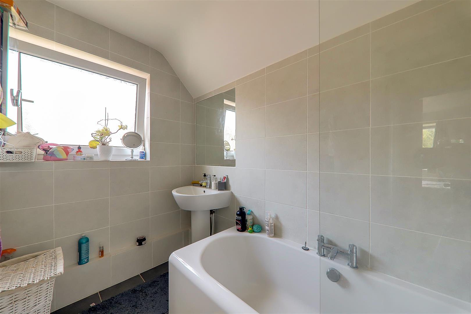 Suite comprising feature bath with central taps and shower above and pedestal wash hand basin. Tiled walls and tiled floor. Double glazed window. Towel radiator.