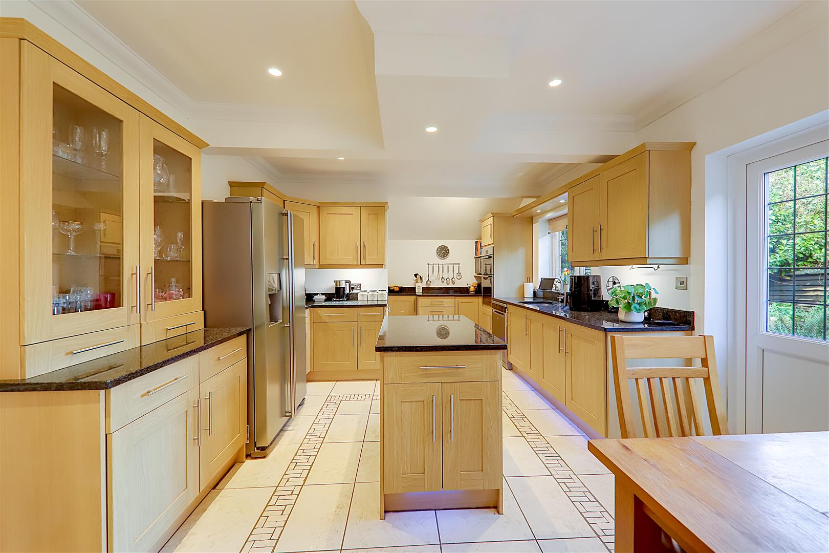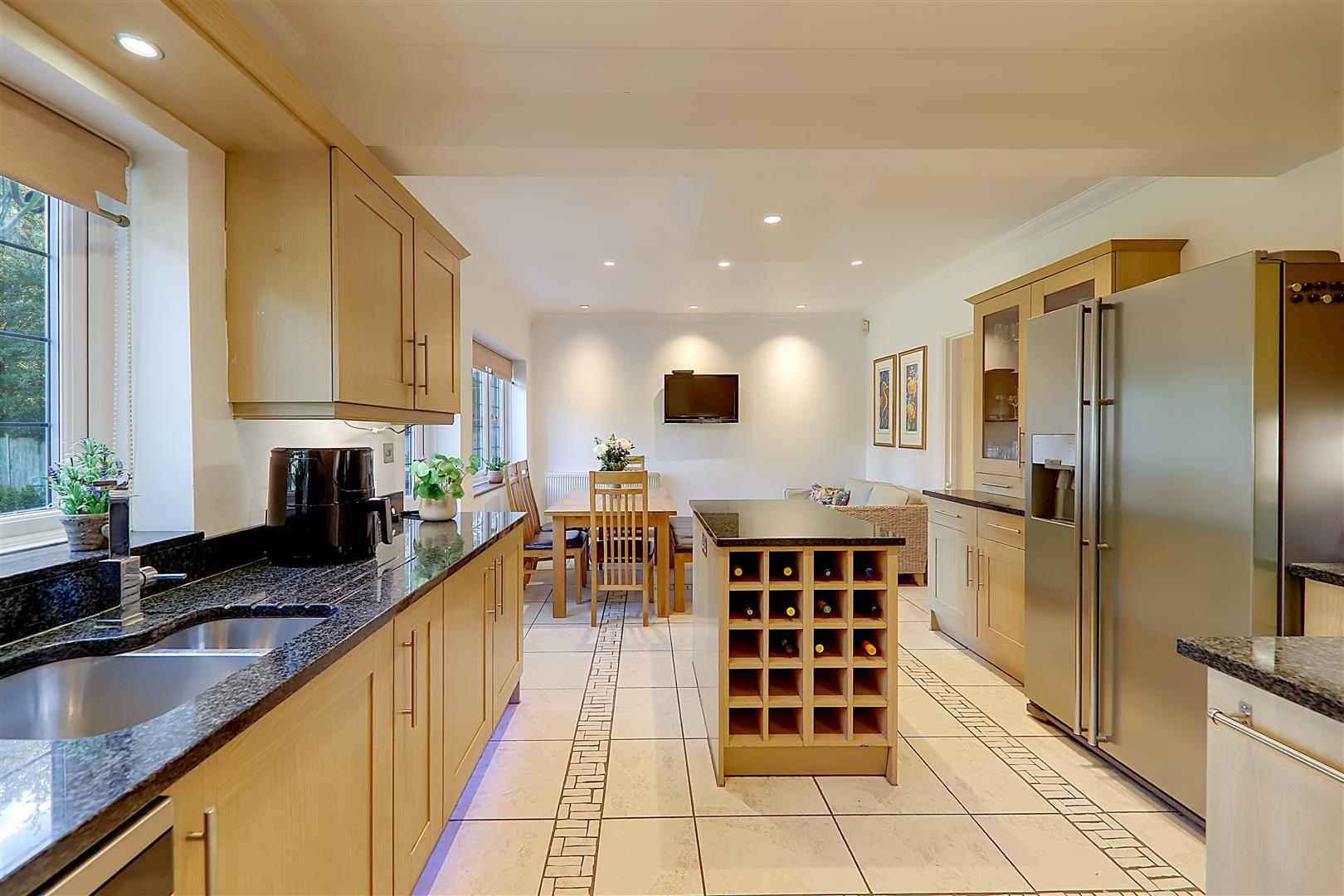 Fitted suite comprising of a one and a half bowl single drainer sink unit having mixer taps and storage cupboards below. Areas of granite works surfaces offering additional cupboards and drawers under. Matching shelved wall units with lighting under. Inset fitted oven and grill. Inset four ring electric hob. Space for dishwasher, American design fridge/freezer. Space for further appliances. Space for dining table and chairs. Radiator. Tiled flooring. East aspect via leaded light double glazed windows. Levelled and coved ceiling with spotlights. Double glazed door to rear garden.