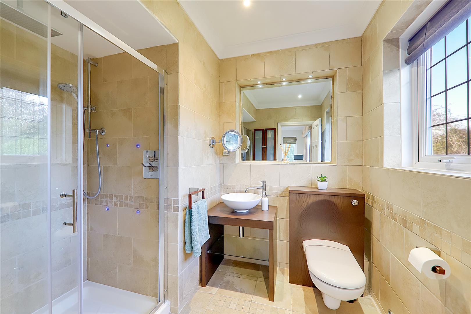 Fitted suite comprising of a step in double shower cubicle having showerhead, shower unit mixer taps and tiled surround. Circular wash hand basin with mixer taps. Low level push button WC. Chrome ladder design radiator. Fully tiled walls. Tiled flooring. Electric shaver point. Levelled and cornice ceiling with spotlights and separate low level lighting. East aspect leaded light double glazed window.