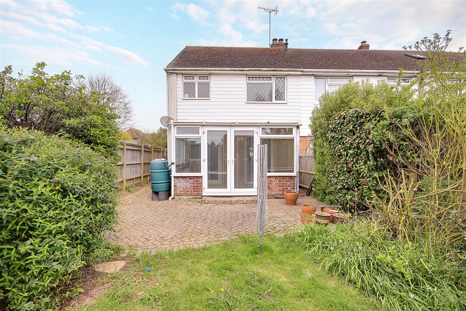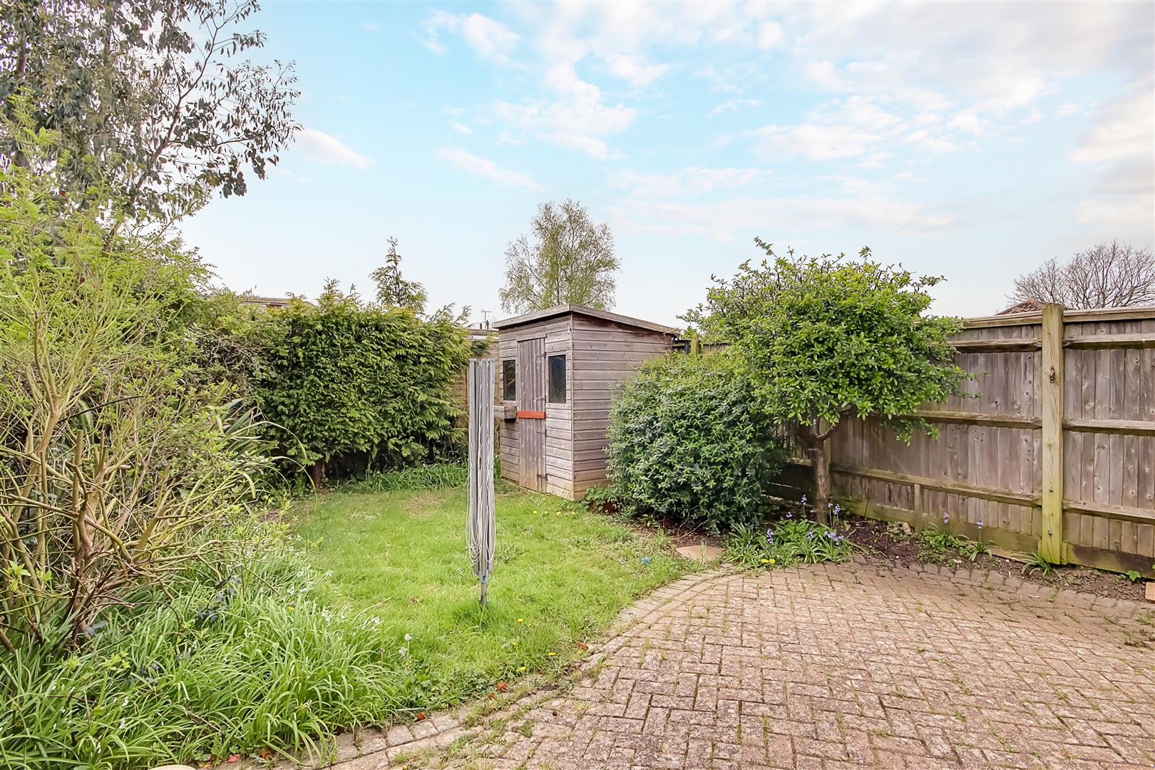 Paved patio area from the conservatory. Lawn area to the rear of the garden with mature shrub boarders. South aspect. Shed. Paved path providing access to the front of the property. Outside tap and water butt.