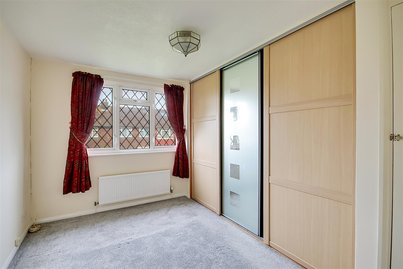 Double bedroom. Fitted wardrobes incorporating hanging rail and shelving. Additional storage cupboard. Radiator. Pendant light. Leaded light double glazed window.