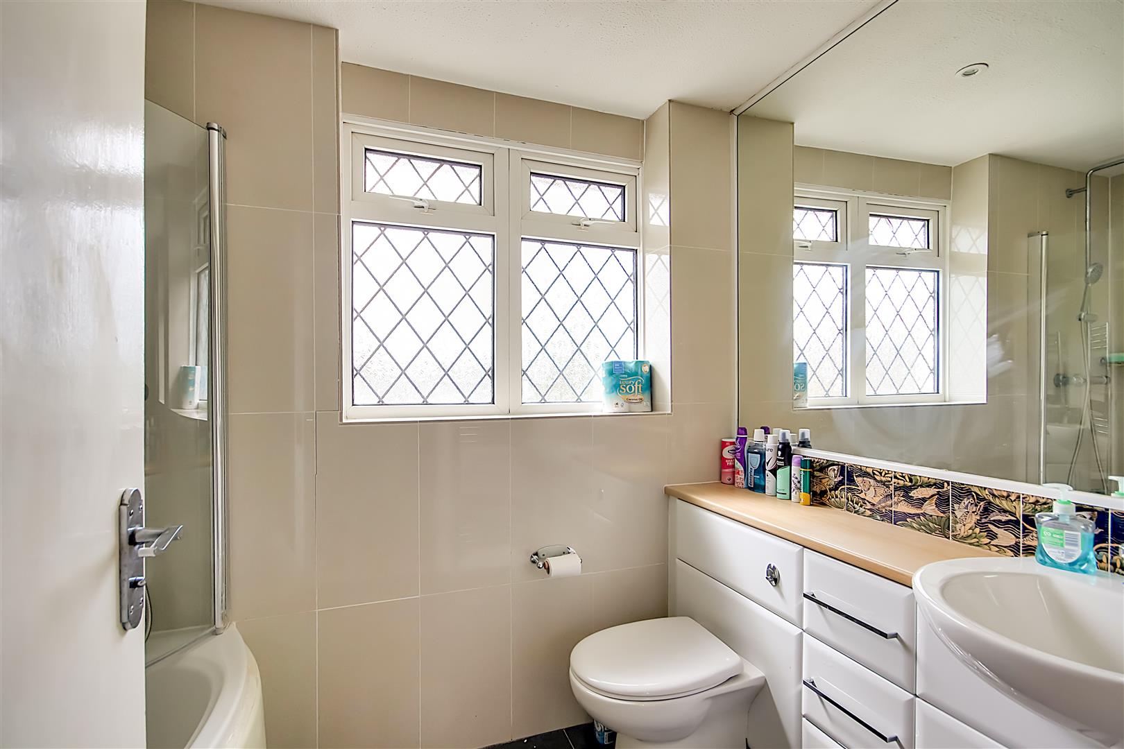 P shape bath with glass screen. Dual function shower. Fully tiled walls. Tiled floor. Concealed cistern WC. Wash hand basin. Ample cabinet storage with mirror above. Obscure double glazed window. Spotlights. Heated towel rail.