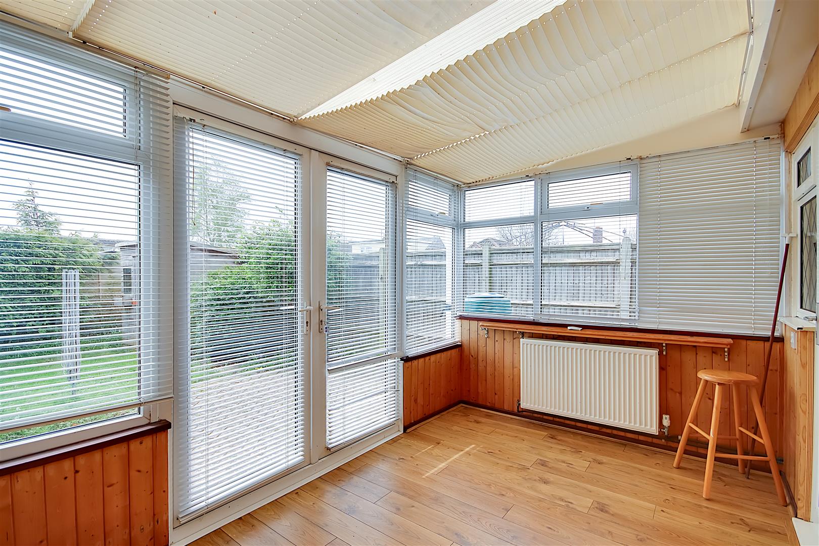 South aspect conservatory with access from the dining space and kitchen. Radiator. Two wall lights. Power sockets. Doors leading to garden.
