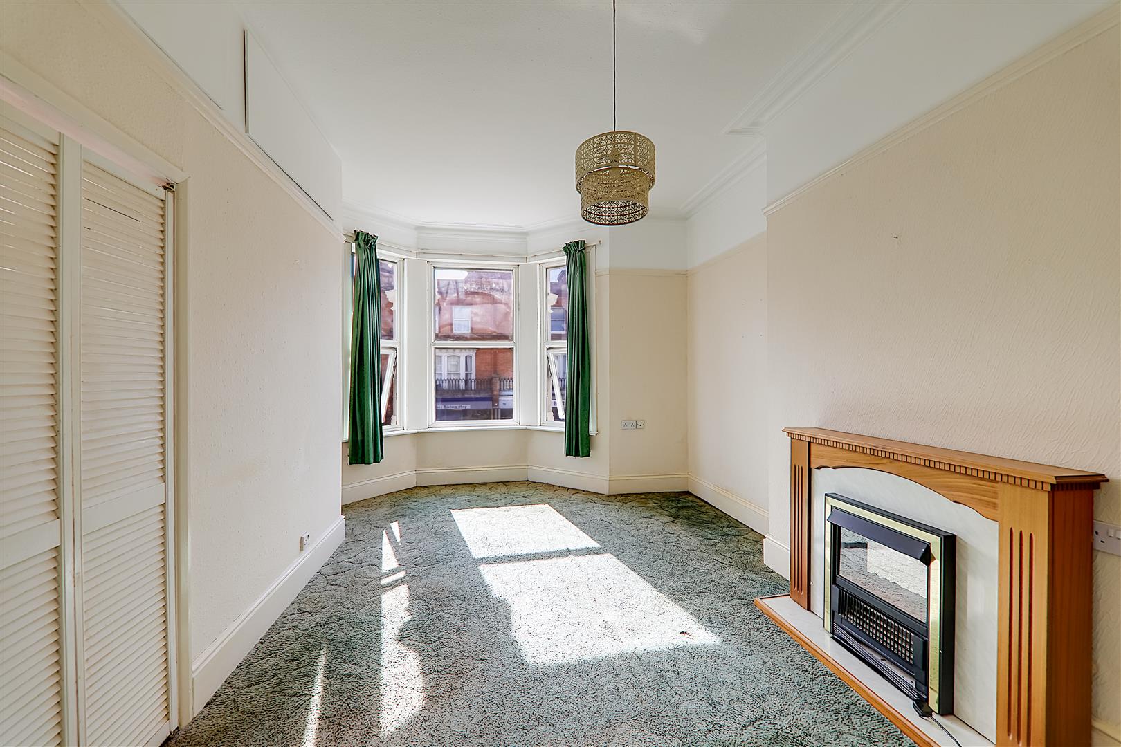 South aspect living room. High ceilings. Double glazed bay window. Carpet. Pendant light. Electric Fireplace.