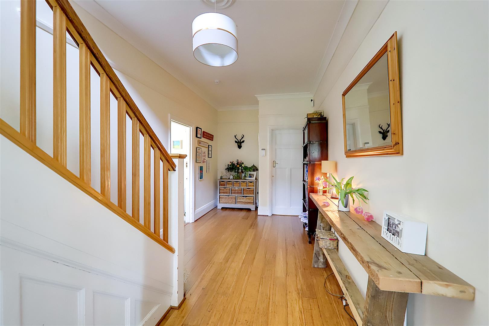 Accessed via a part stained glass wooden front door. West aspect stained glass window. Wood flooring. Coved ceiling. Door to reception hall.