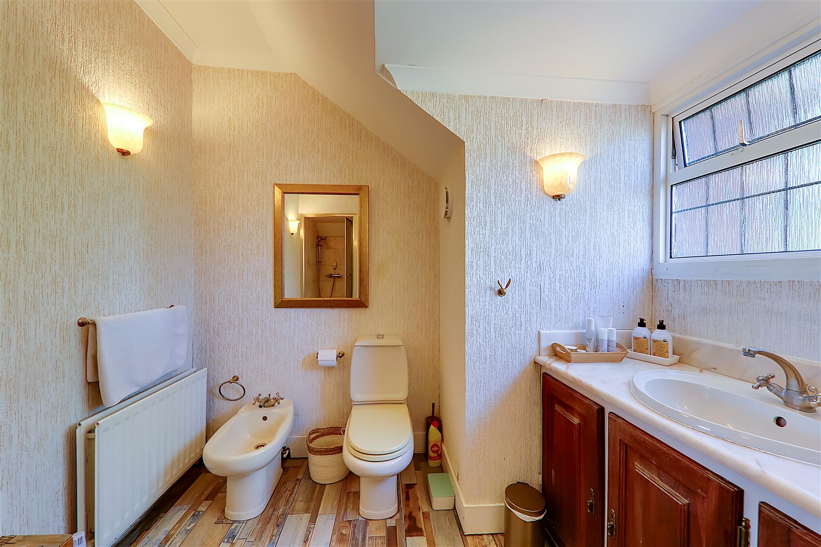 Push button w.c. Pedestal wash hand basin with mixer taps. Chrome ladder design radiator. Wood flooring. Coved ceiling. Obscure glass leaded light window.
