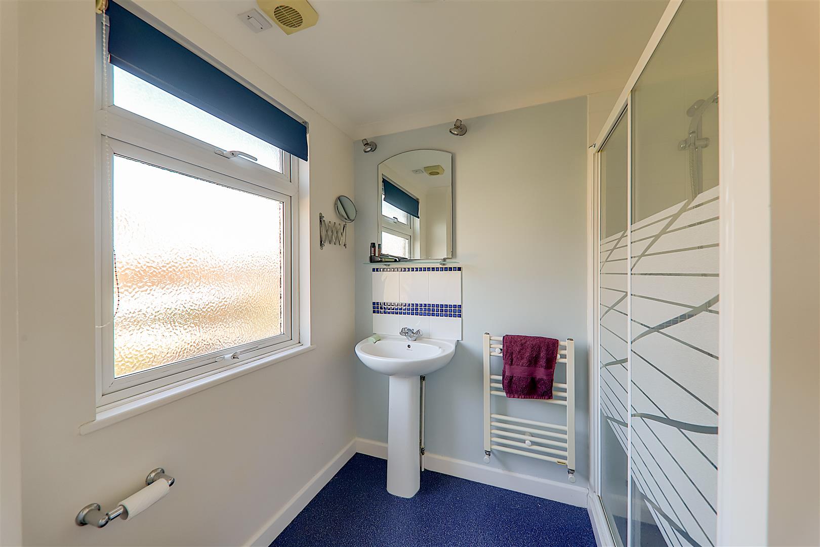 Fitted suite comprising of a step in double shower cubicle having shower unit and tiled surround. Pedestal wash hand basin with mixer taps and having tiled splashback. Mirror with spotlights over. Low level WC. Ladder design radiator. Built in shelved storage cupboard. Levelled and coved ceiling with extractor fan. Obscure glass double glazed window.