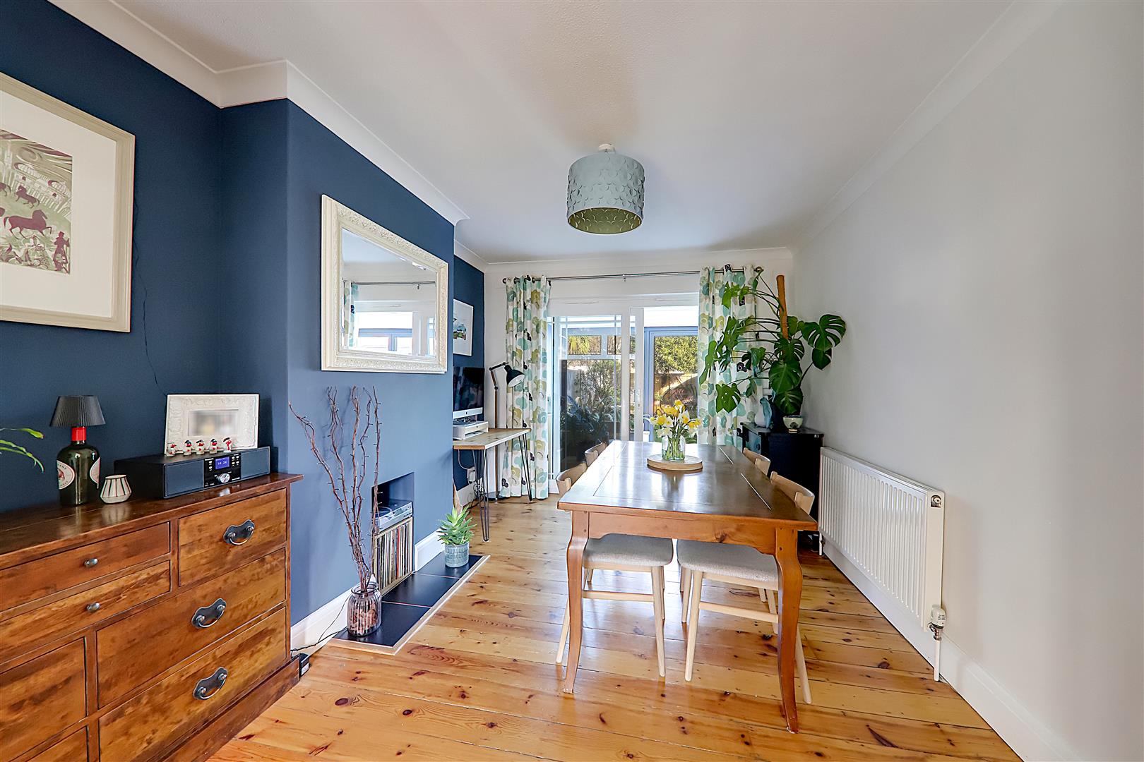 West aspect via a double glazed bay window with fitted blinds. Feature fireplace having raised hearth, surround and mantle over. Two radiators. Dimmer switch. Stripped and stained wood floorboards. Coved ceiling. Opening to dining room.