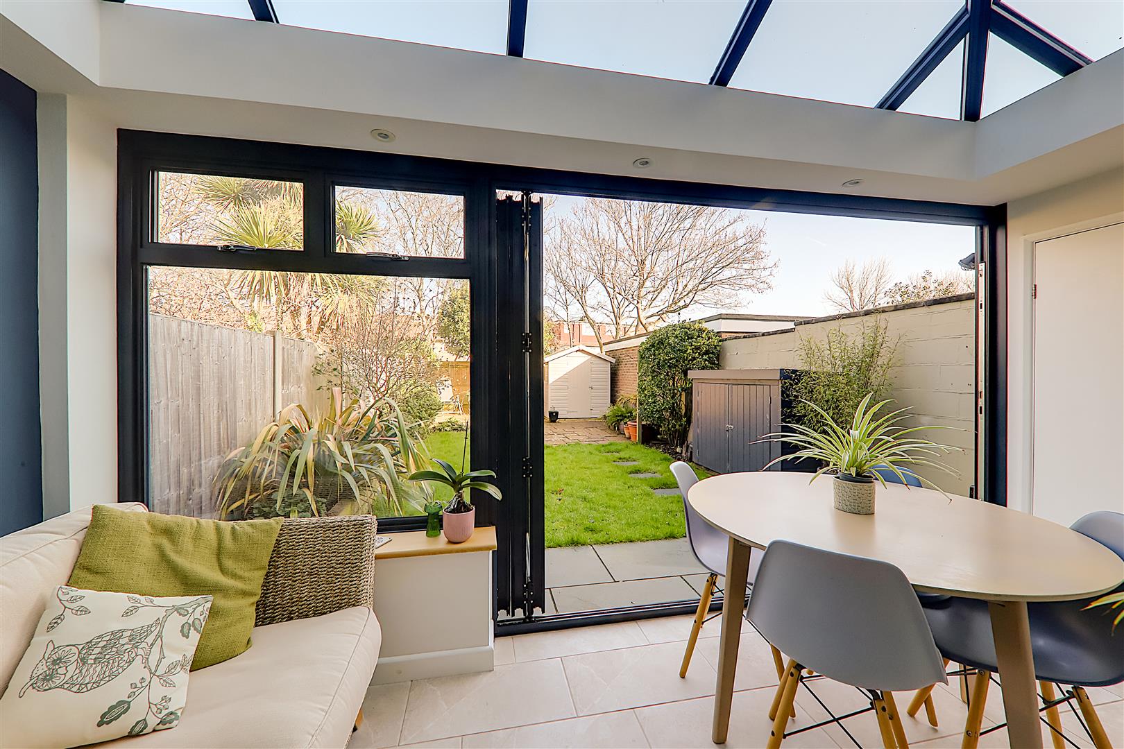 East aspect via double glazed windows and bi-folding doors to the rear garden. Built in storage cupboard. Tiled flooring. Radiator. Levelled ceiling with spotlights and feature roof lantern.
