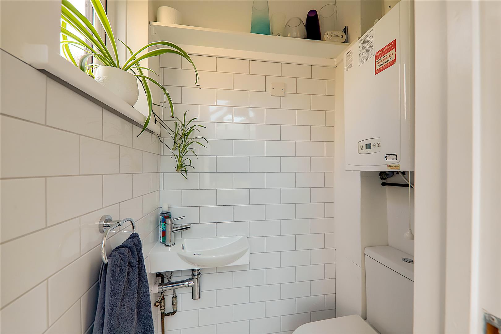 Push button WC. Wall mounted wash hand basin with mixer taps. Wall mounted central heating boiler. Tiled walls. Tiled flooring. Levelled ceiling with spotlight. Obscure glass double glazed window.