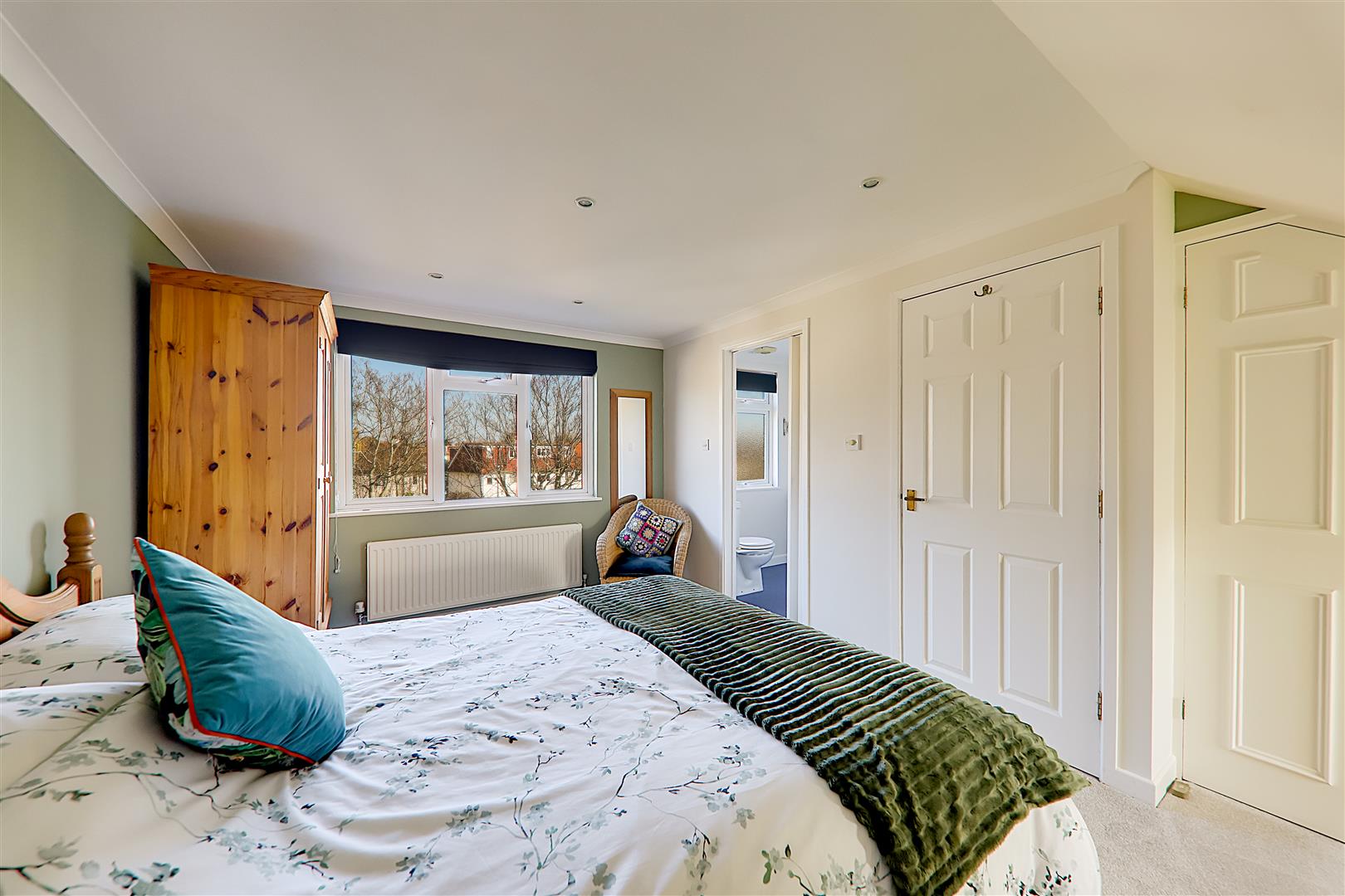 Dual aspect via a West facing Velux window and East facing double glazed windows. Radiator. Dimmer switch. Built in wardrobe. Eaves storage cupboard. Levelled and coved ceiling with spotlights.