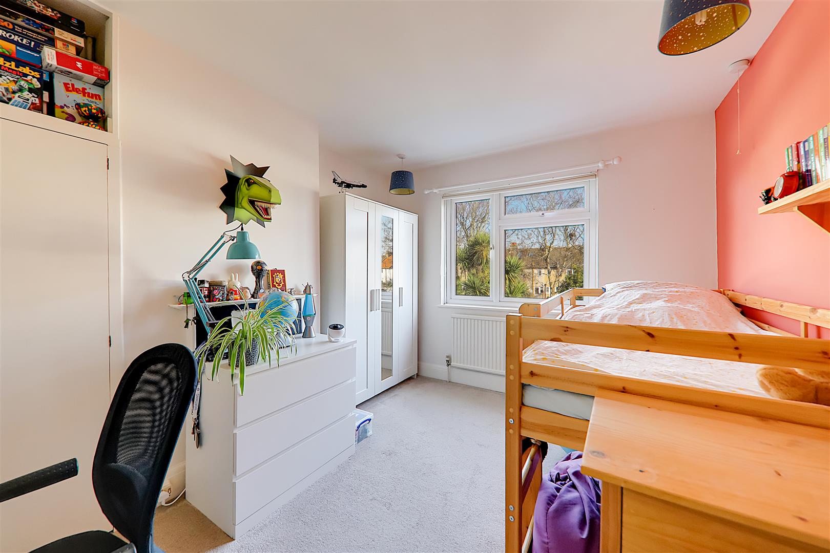 East aspect via double glazed windows. Radiator. Decorative fireplace. Built in storage cupboard. Levelled ceiling.