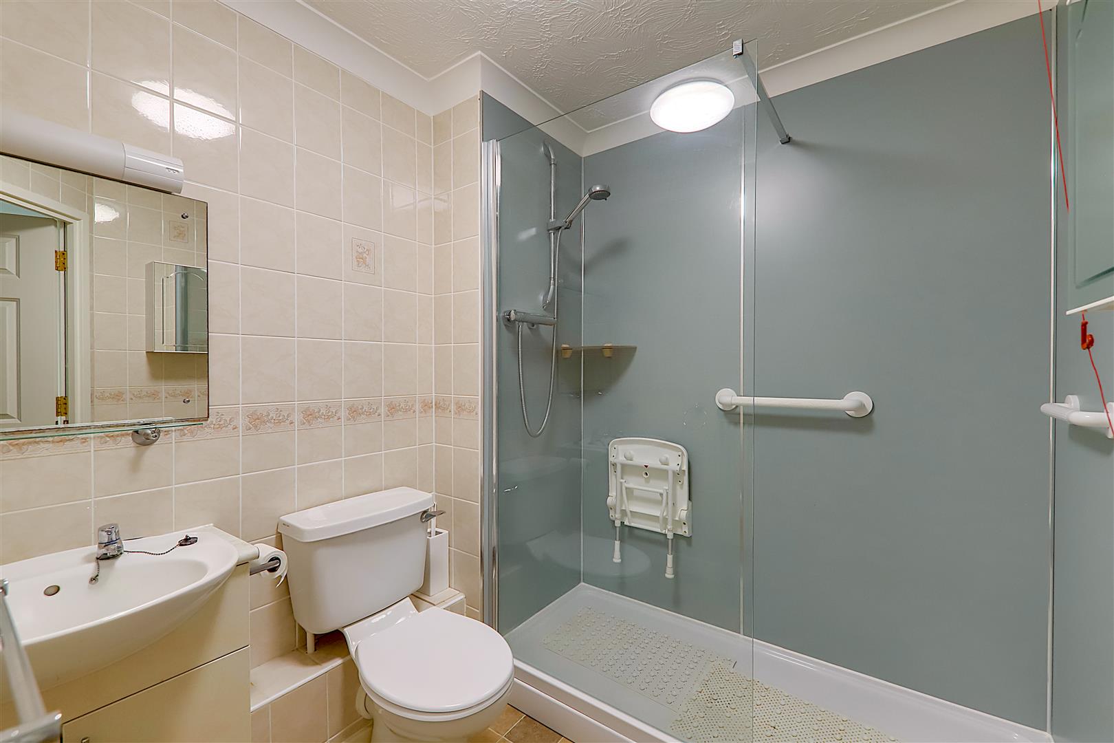 Step in shower tray with glazed screen and wall mounted controls. Close coupled wc. Vanity unit with wash hand basin. Electric radiator. Extractor fan. Mirrored medicine cabinet. Emergency pull cord.