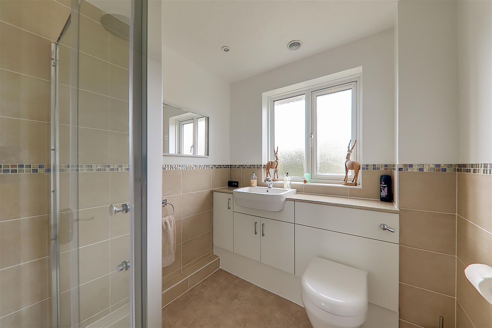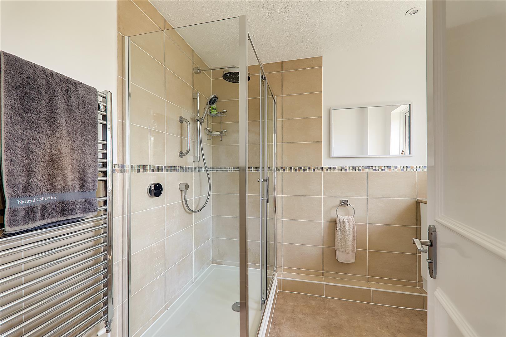 Step in double cubicle with independent shower unit, vanity surface with inset wash hand basin, cupboards under and concealed cistern Wc. Chrome towel radiator. Part tiled walls. Extractor fan. Double glazed obscure glass window. Inset spotlights. Vinyl flooring throughout.