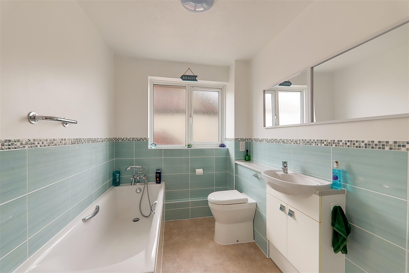 Suite comprising panelled bath with mixer tap over and telephone style shower attachment, tiled vanity surface with inset wash hand basin and concealed cistern Wc. Part tiled walls. Double glazed obscure glass window.