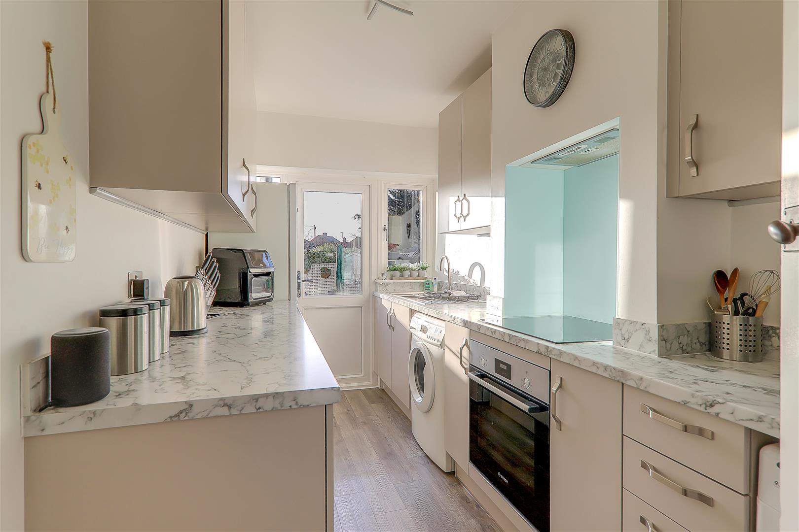 LVT flooring, roll edge laminate work surfaces with cupboards below & matching eyel level cupboards with under cupboard LED lighting, inset stainless steel one & a half bowl single drainer sink unit with mixer tap, space & provision for washing machine, space for fridge freezer, space for tumble dryer, PVCU double glazed door leading to rear garden, skimmed ceiling.
