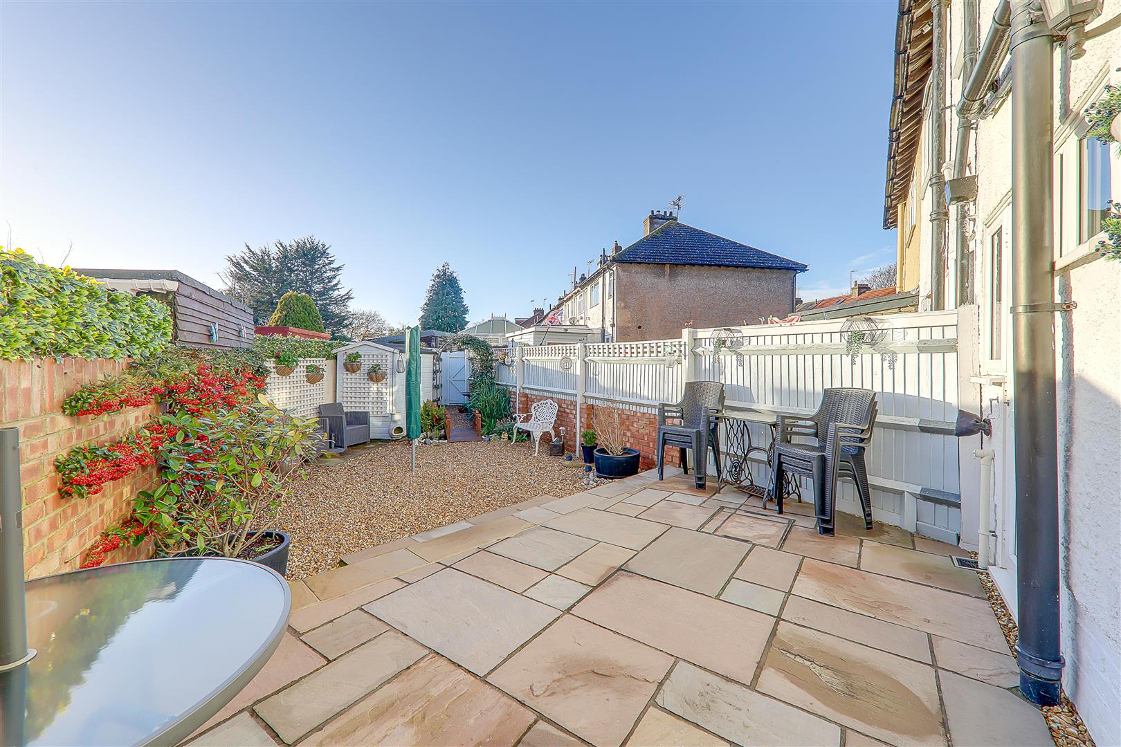 Spacious patio area stepping down onto shingle area, having various flower borders, feature fish pond with timber built bridge over, timber built storage shed, gated rear access, outside power & lighting, fence & wall enclosed.