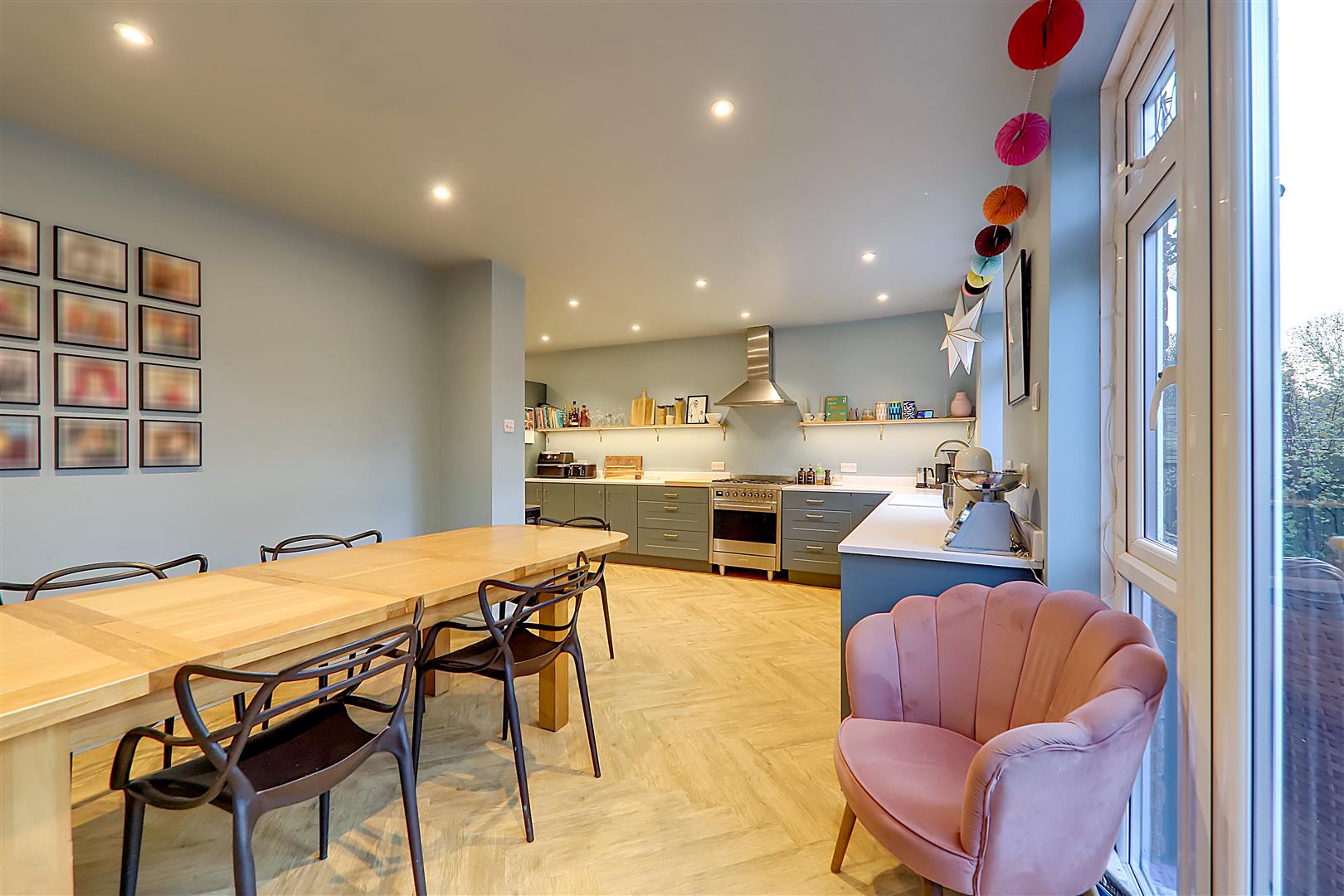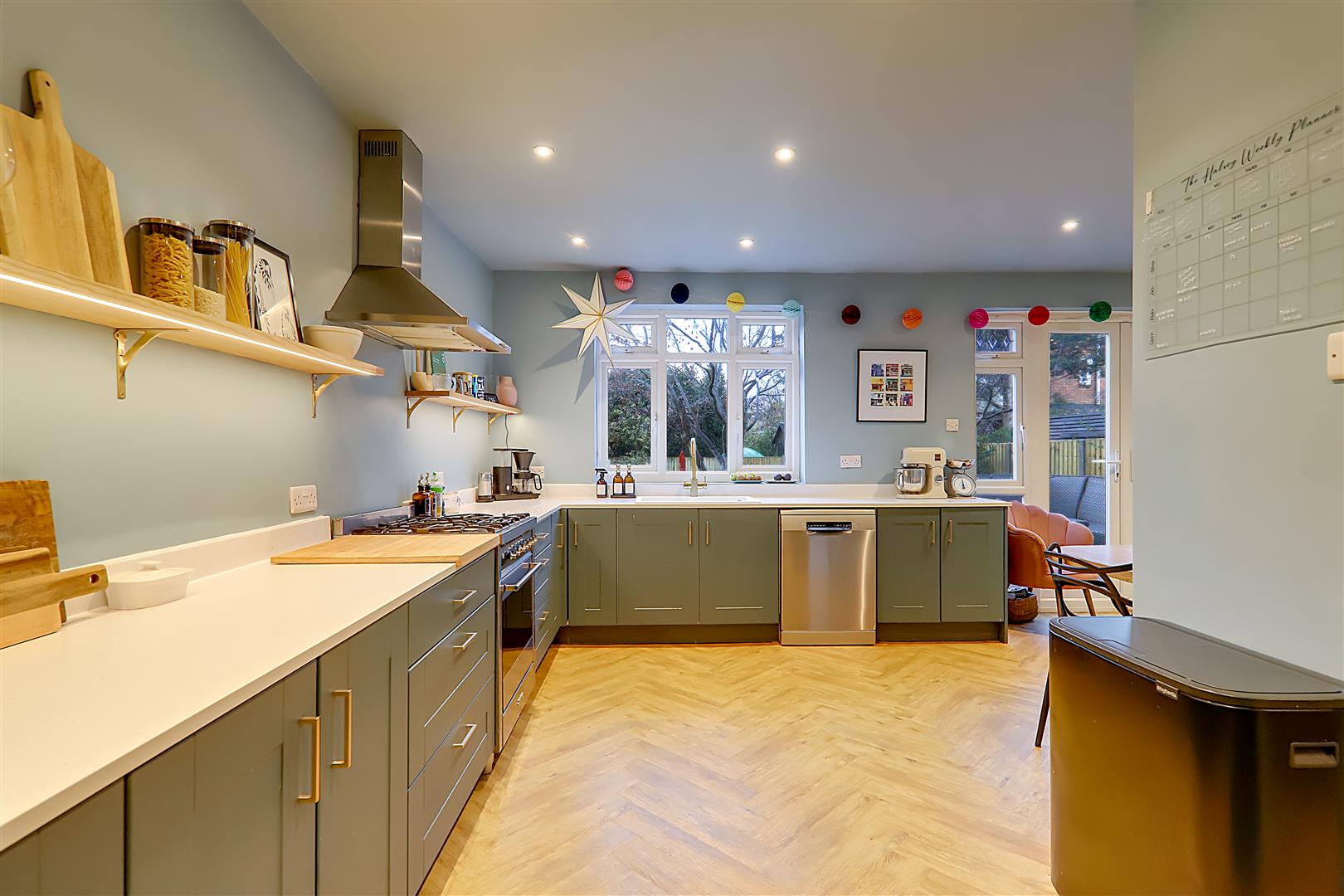 Fitted suite comprising of a double sink unit with 'Fohen' boiling water tap and having storage cupboard below. Areas of work surfaces offering additional cupboards and drawers under. Matching double pantry. Space for cooker, dishwasher and American design fridge freezer. Radiator. Space for dining table and chairs. Wood effect LVT flooring. Levelled ceiling with spotlights. Dimmer switches. West aspect double glazed windows and double glazed French doors to rear garden.