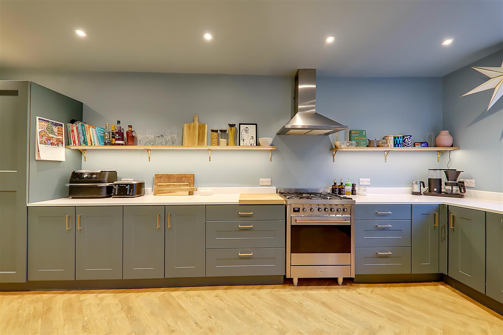 East aspect obscure glass double glazed window. Worksurface area with storage cupboards and space for washing machine below. Matching broom cupboard. Wine rack. Radiator. Wood effect LVT flooring. Ceiling spotlights.