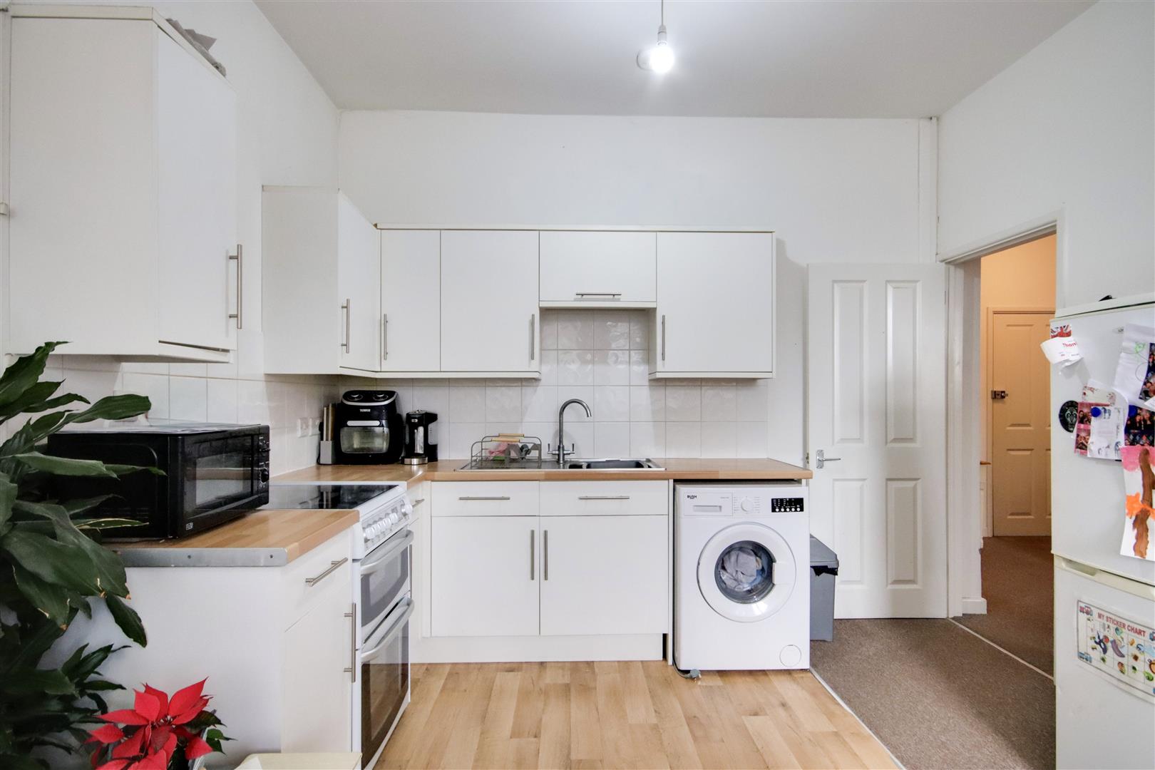 The kitchen area is fitted with vinyl flooring and features matching wall and base units. There is a single stainless steel sink with drainer and mixer tap, with cupboards and drawers below, along with additional matching cupboards and drawers above. The space provides room for a washing machine and oven and benefits from part-tiled walls. Carpeted living area with two double glazed windows. Gas central heating radiator.