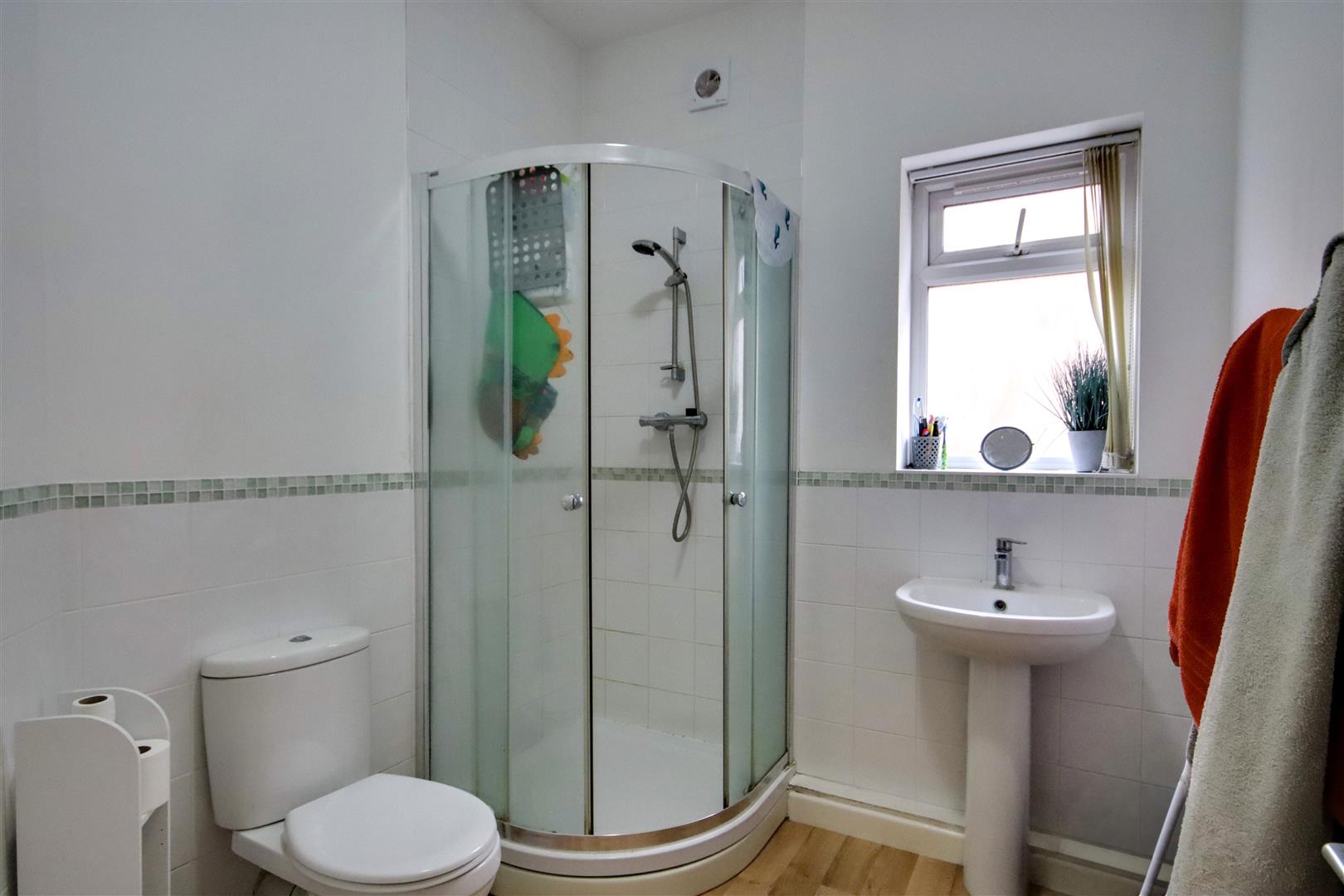Compromising vinyl flooring and part-tiled walls, with a heated towel rail, push-button WC, and a pedestal wash basin with mixer tap. There is a fully tiled shower cubicle, a double-glazed window, and a single ceiling light fitting.