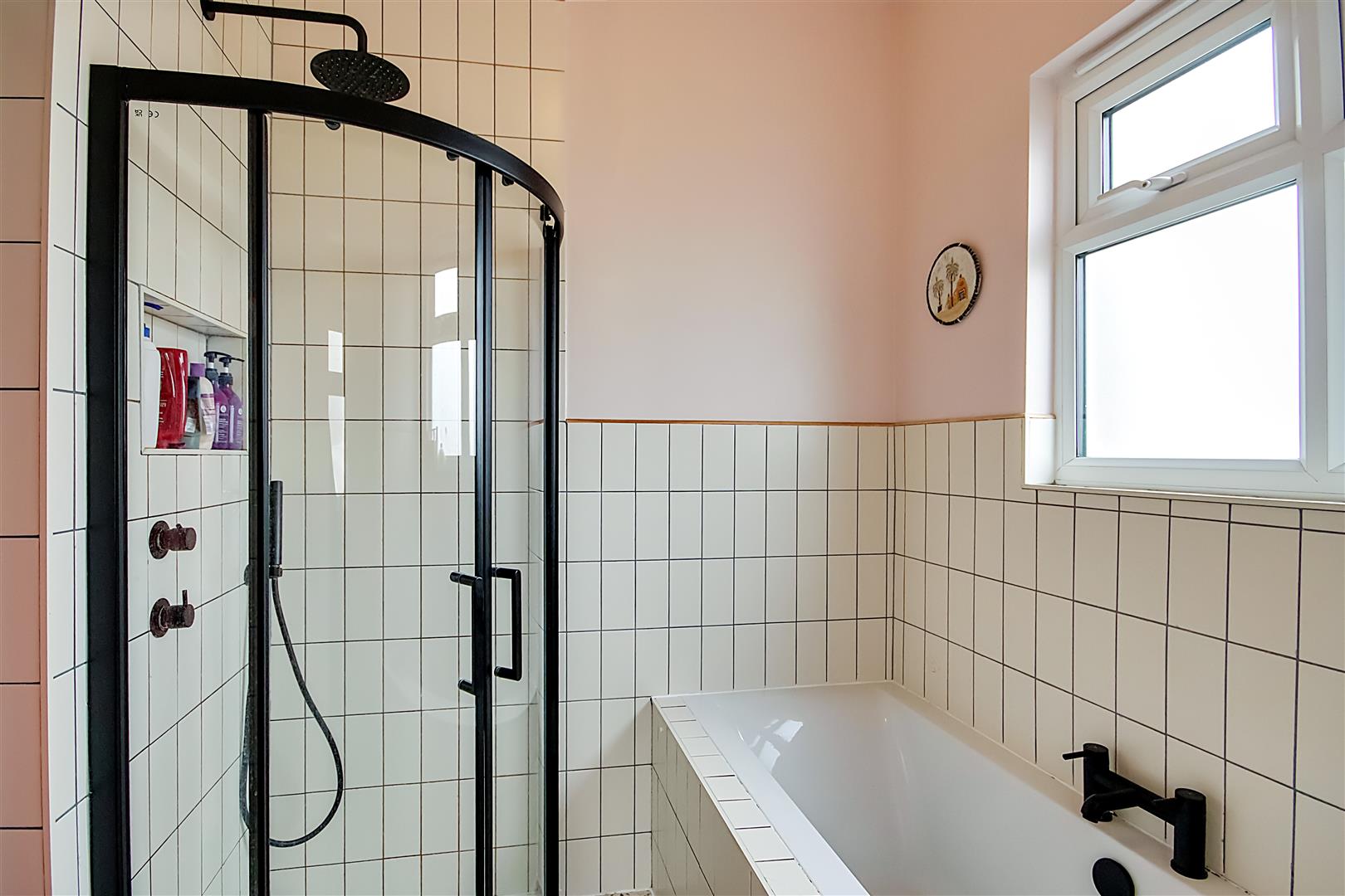 Vinyl flooring, tiled enclosed bath with mixer tap, fitted shower cubicle having an integrated power shower with rainforest fall shower head, part tiled walls, low flush WC, contemporary hand wash basin with mixer tap & vanity unit below, ladder style heated towel rail, double glazed windows, extractor fan, skimmed ceiling.