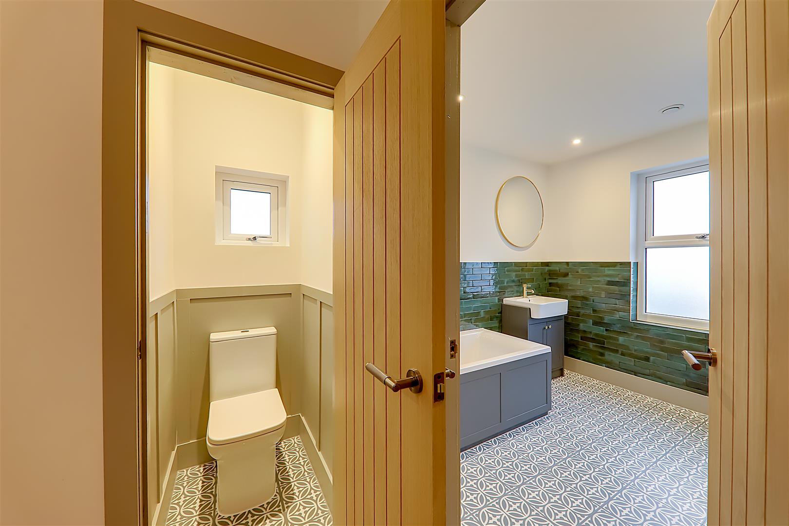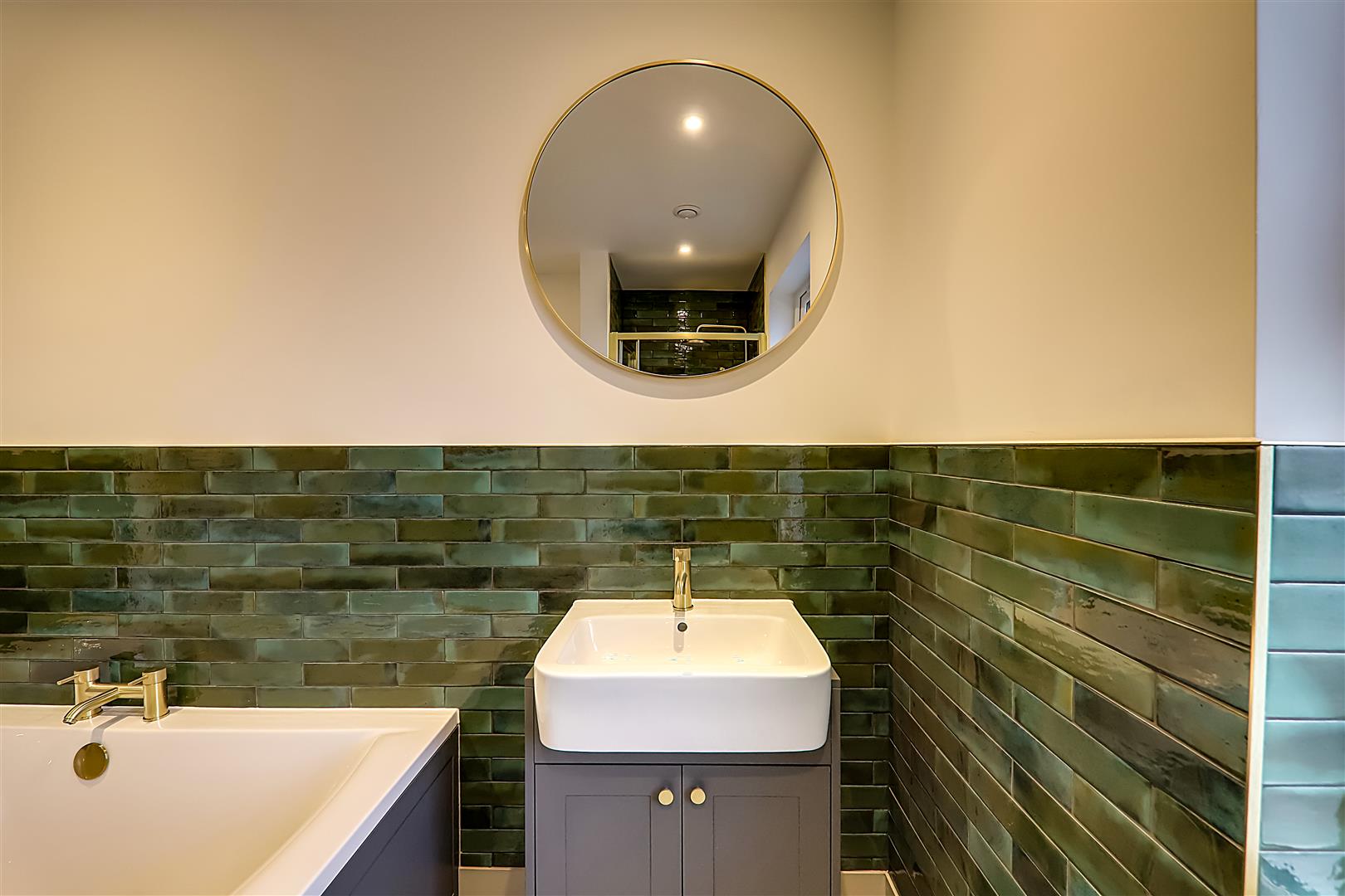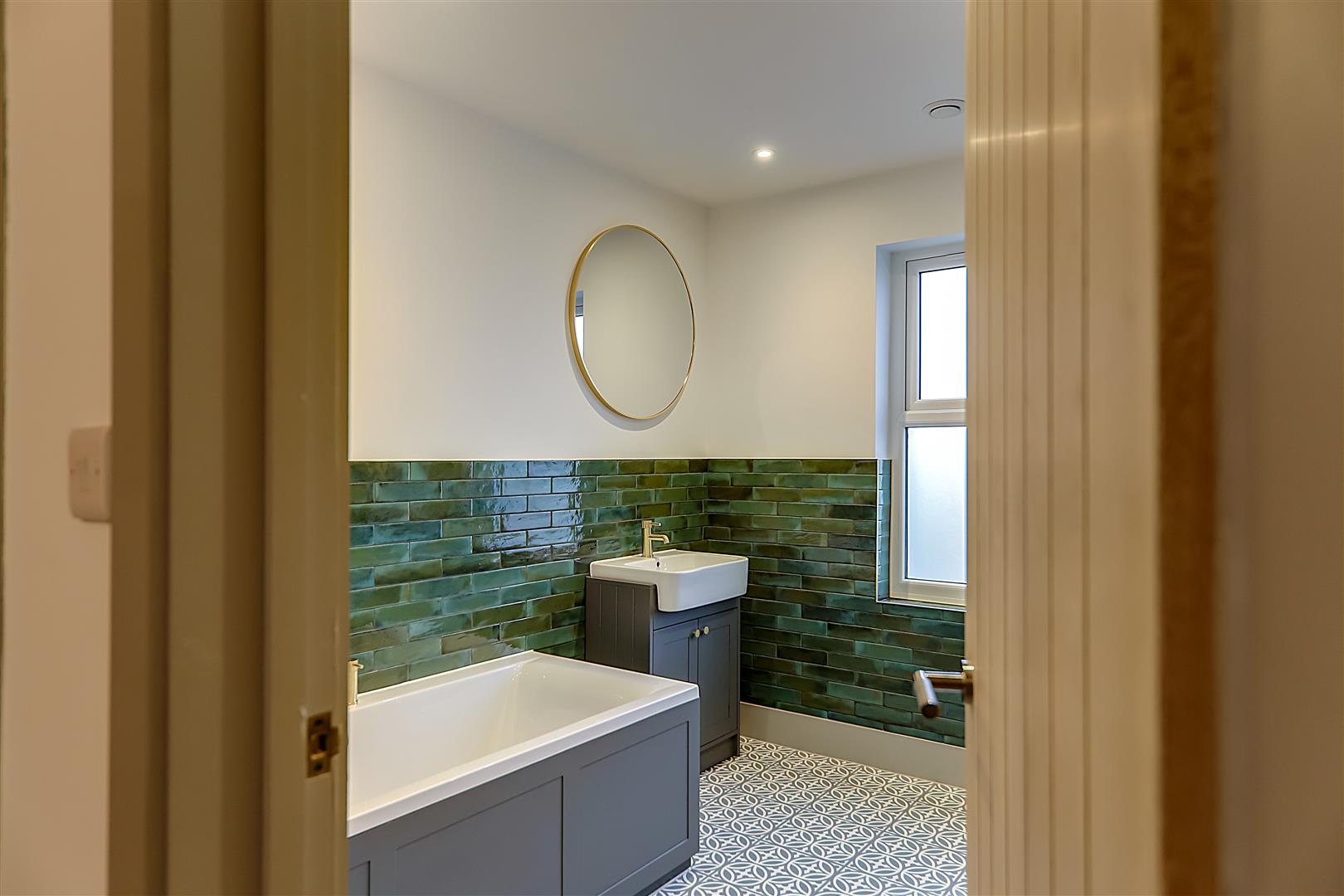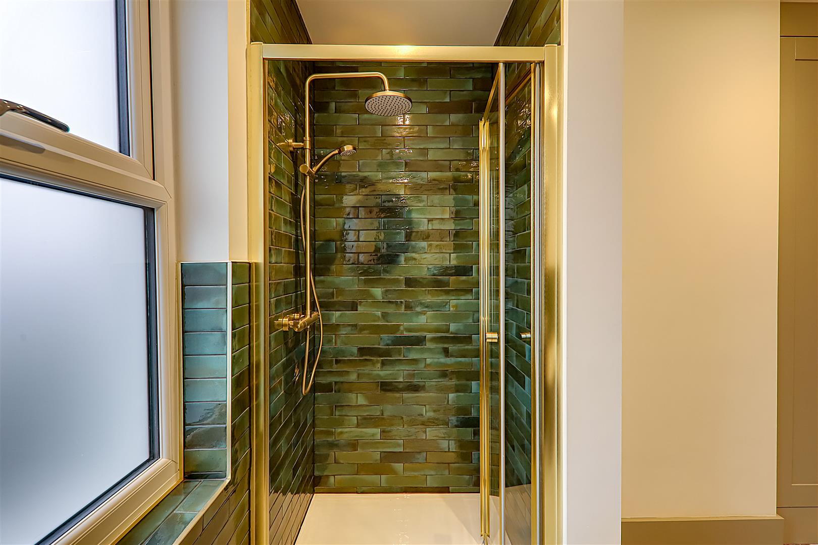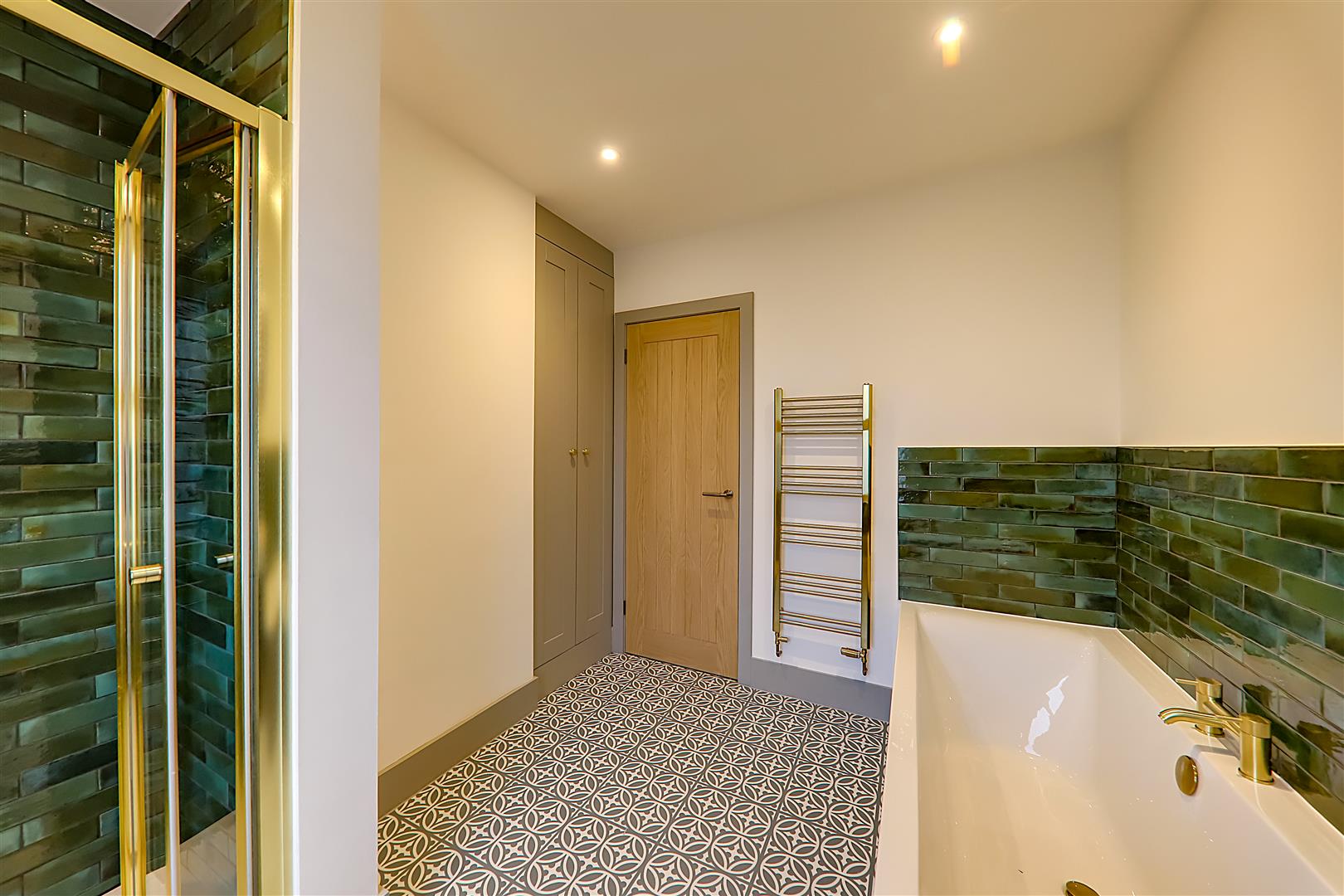 Part tiled in attractive ceramics. Refitted modern suite comprising of deep panelled bath with mixer taps. Vanity unit with wash hand basin with mixer tap having cupboard under. Walk in fully tiled separate shower with large overhead shower head. Glazed folding shower door. Vertical radiator/towel rail. Recessed ceiling spot lighting. Double glazed window. Alcove with fitted cupboard housing 'Glow worm' gas fired boiler supplying hot water and central heating. Extractor fan.
