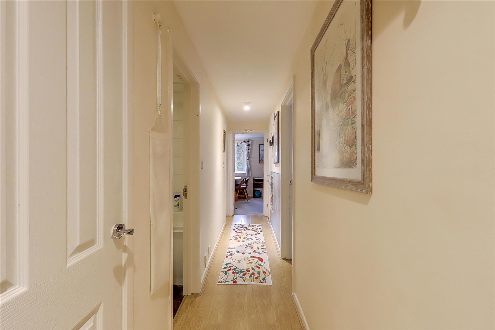 Space for coat and shoe storage by entrance door. Further door leading to internal hallway. Phone entry system. Hard flooring. Pendant light. Airing cupboard housing hot water tank. Storage cupboard.