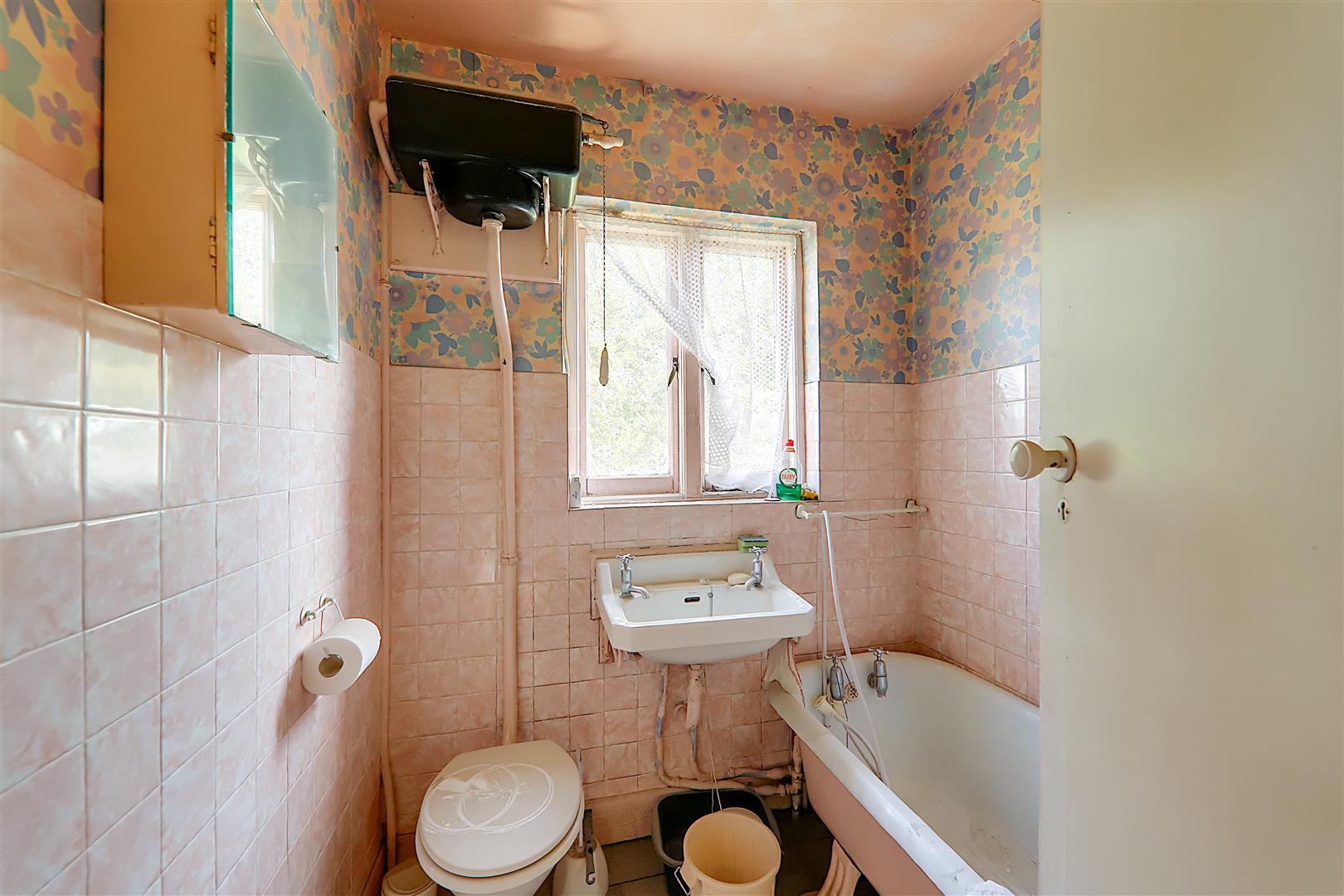 Freestanding bath. Wall mounted wash hand basin. High-level WC. Part tiled walls. Window. NB: please note the bathroom is in need of complete renovation and also requires a water leak repairing before works commence.