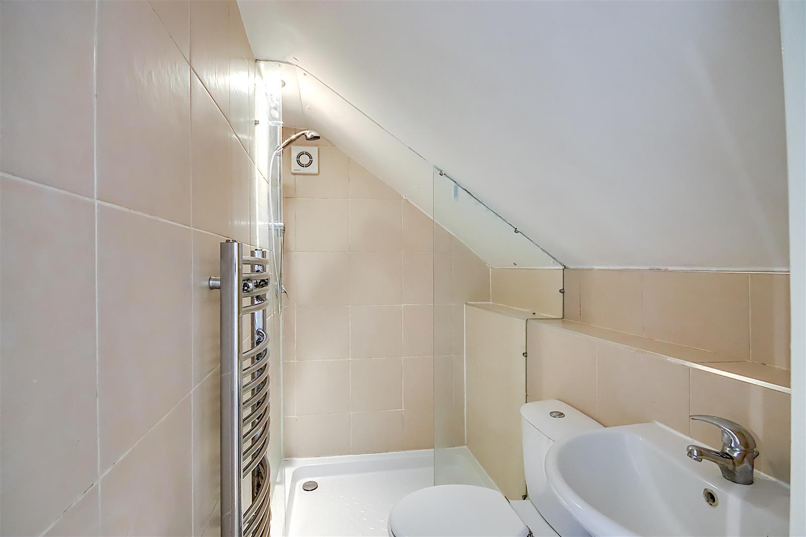 Double shower cubicle with wall mounted controls. Push button w/c. Wash hand basin with mixer taps. Ladder style radiator. Tiled walls. Extractor fan.