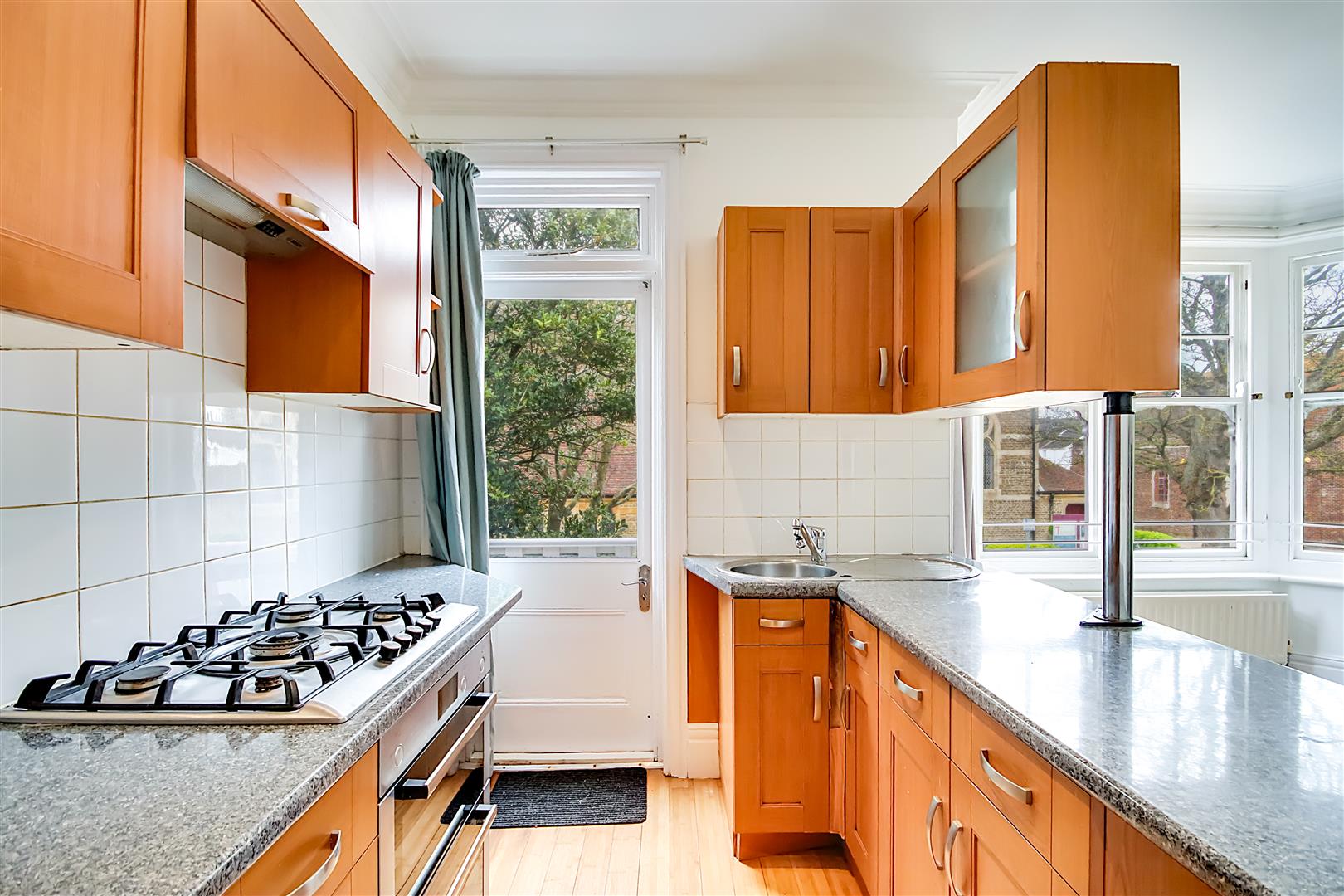 Areas of work surface incorporating single drainer sink unit with mixer tap and drainer. Integrated 5 ring gas hob with tiled splashback, concealed extractor above and oven below. Integrated fridge/freezer. Range of matching cupboards, drawers and wall units. Levelled ceiling. Inset spotlights. Door leading to private balcony.